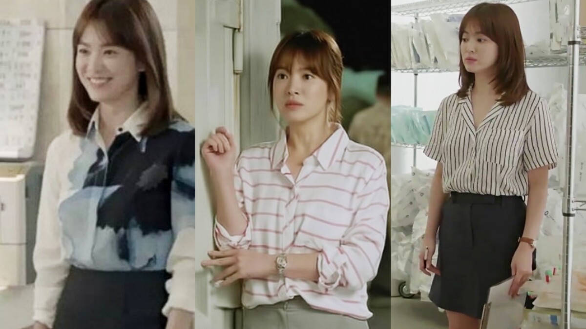 雖然現實中王子和公主的幸福婚姻無法延續下去,但男女主角在《太陽的後裔》中的浪漫劇情早已深刻地印在粉絲們的腦海中。而為了呼應海外戰地營區的乾熱氣候與環境,宋慧喬的劇中穿著打扮則偏向簡單的率性女孩風,好比襯衫搭配短裙,展現專業卻不失女人味的野外職場裝扮,仔細觀察,襯衫樣式多以條紋或是花印款,和純白襯衫相比下少了拘謹的氛圍,再來像是西裝外套搭配T-Shirt也具相同道理。