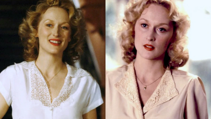 造型方面,Meryl Streep多以清秀佳人的形象亮相,好比拼接上細緻蕾絲的衣領設計,比起一般單一面料的純色襯衫來得更加優雅。