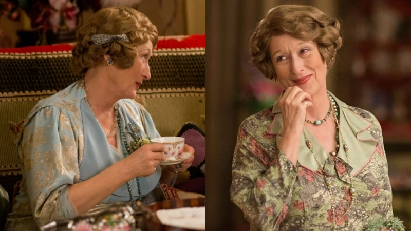 然而Florence Jenkins走的名媛風並非高雅大器路線,而是以超級華麗且浮誇的裝扮取勝。像是金粉點綴的印花洋裝,再搭配上一層又一層的項鍊,甚至連少女喜愛的蝴蝶結髮飾也不放過,完全沒在管所謂的“Less is More”。