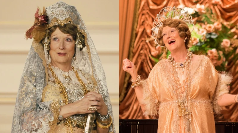 說到Florence Jenkins的舞台造型更是比日常裝扮浮誇個好幾倍!少不了的閃耀元素和大量的珠寶首飾配戴,最後再戴上一頂效果十足的頭飾,你說,這樣上舞台能不吸引眾人目光嗎?