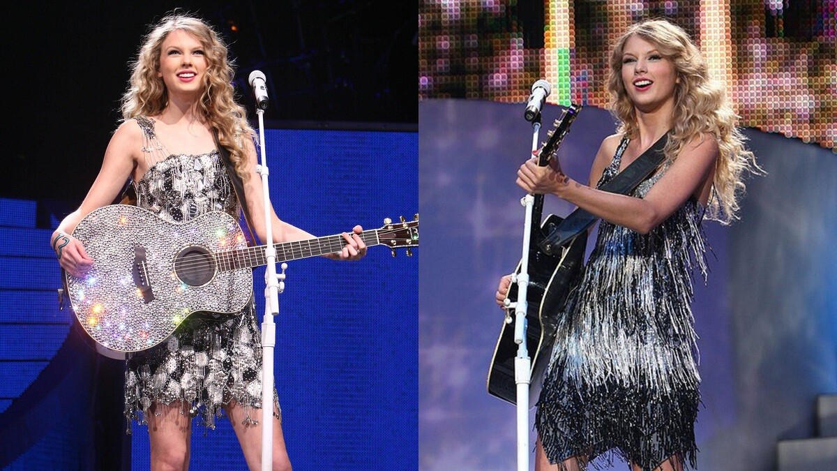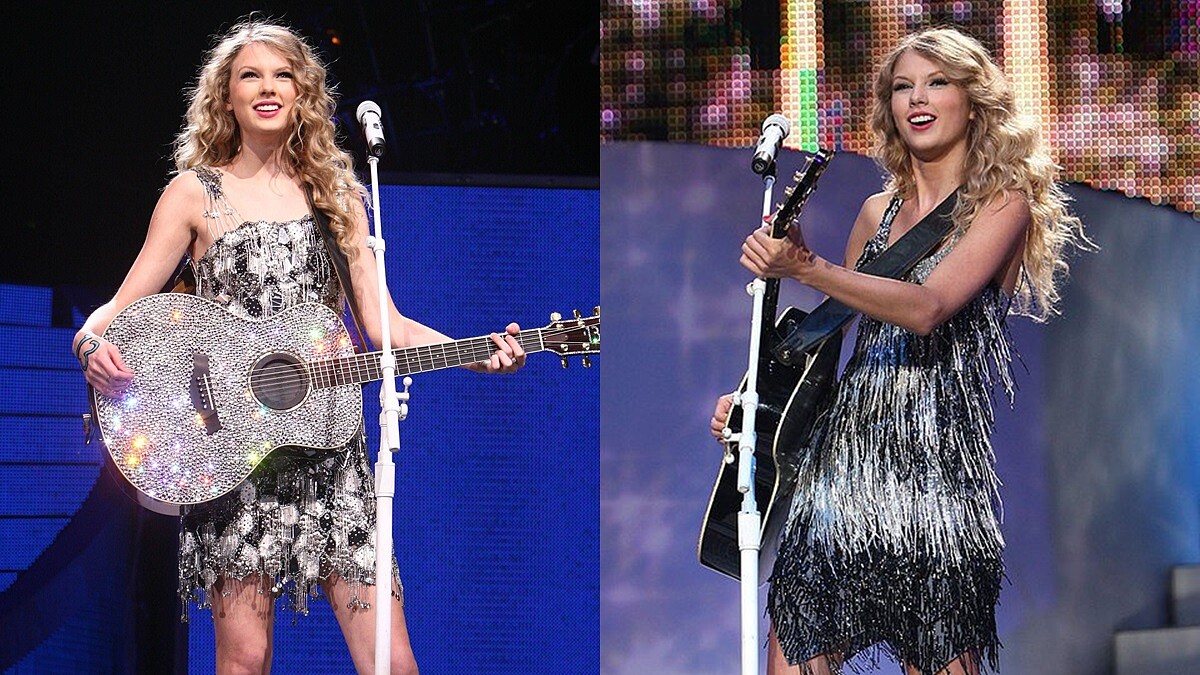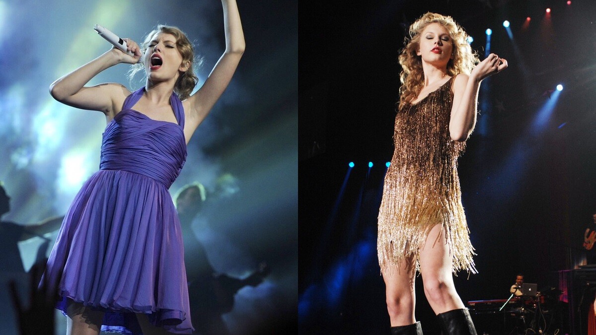 上到舞台後,泰勒絲的造型遊走於氣質小公主與鄉村流行歌手之間,不論是紫色連衣裙,又或是金色流蘇小洋裝,其實都能看得出泰勒絲慢慢轉型的過程。