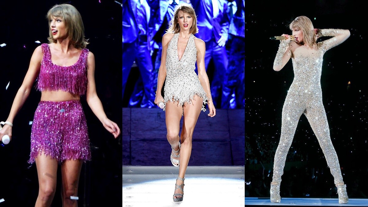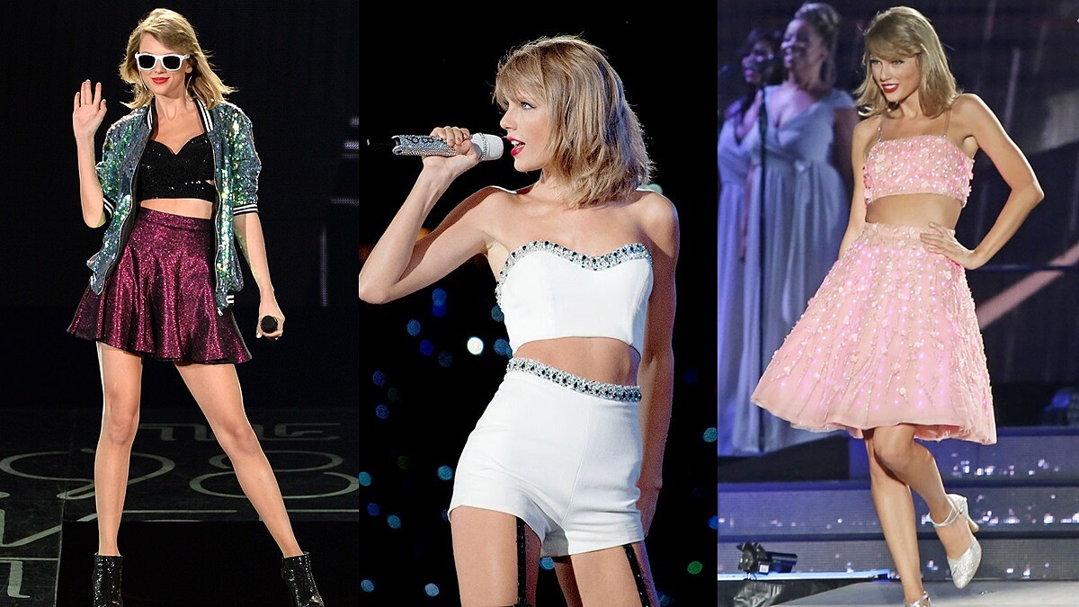 在專輯《1989》中泰勒絲最具代表性的造型,無疑就是平口上衣的百變穿搭,不論是搭配酒紅色百摺裙、白色小短褲、或裝有LED燈的長裙,你說,這樣上舞台能不吸引眾人目光嗎?