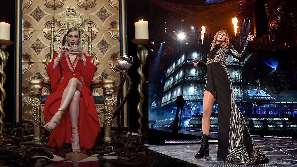 泰勒絲除了身材圓潤且結實不少,更不再以亮色系禮服登場,而是換成V字領長裙搭配金色綁帶鞋、全黑開衩式禮服等性感風格,猶如女王回歸寶座般的氣勢,真的與《1989》裡的清新淑女風完全搭不上邊。