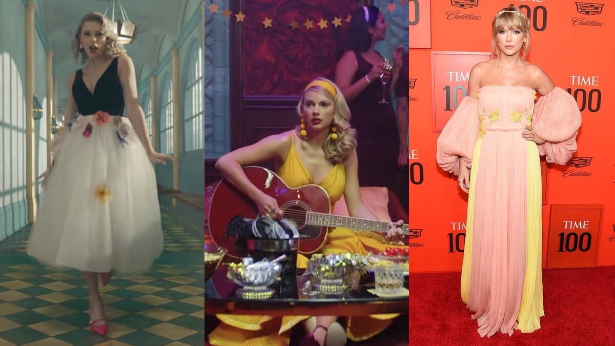 以愛為靈感的泰勒絲,在造型風格上找回原先的色彩,但又增添了一些性感成熟風韻,像是深V字的上衣配鑲有花朵的雪紡澎澎裙、鮮明的黃色V領傘襬洋裝、粉色平口禮服等,各個仙氣十足,看得出那位鄉村小女孩已成長為一位美若天仙的美人。