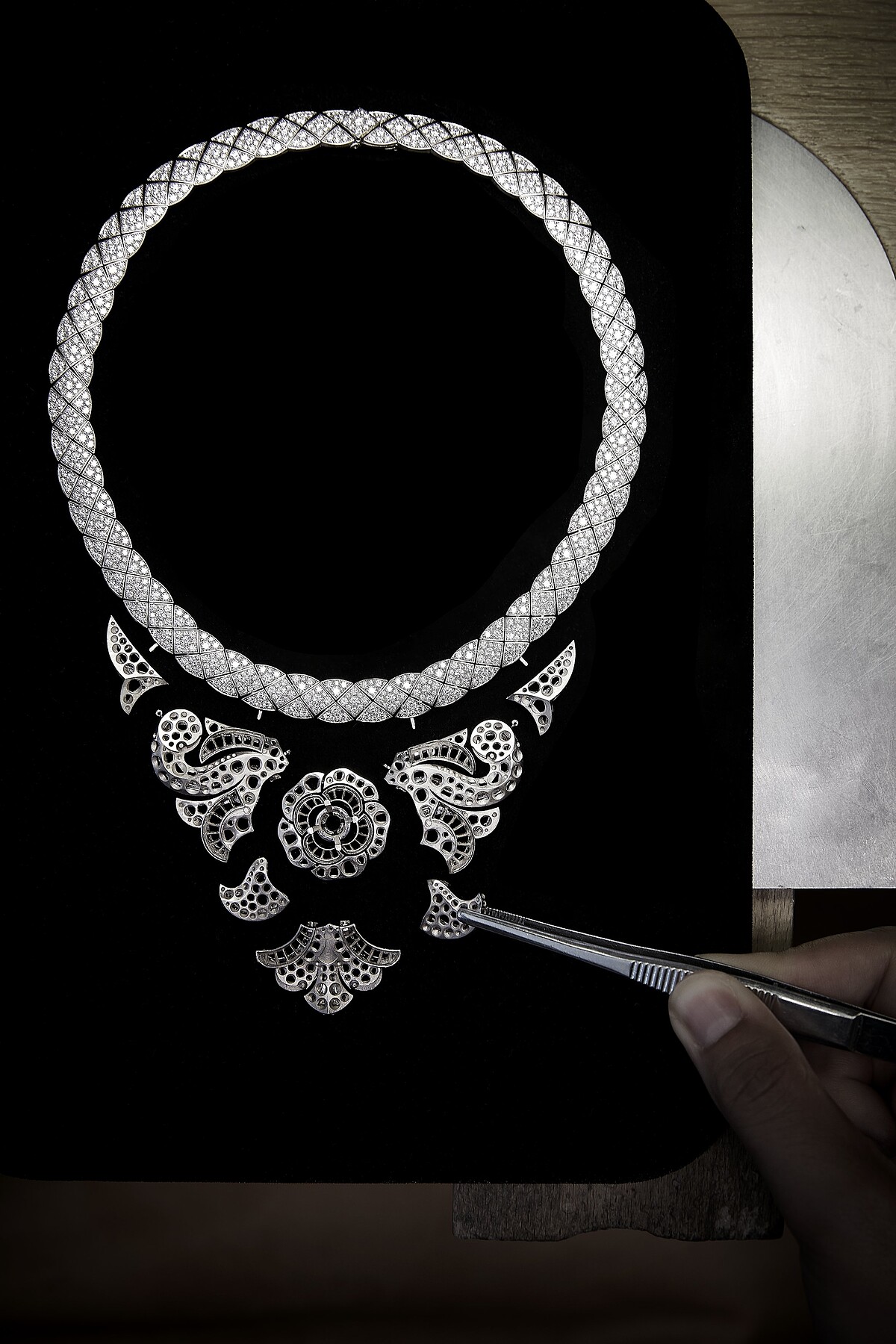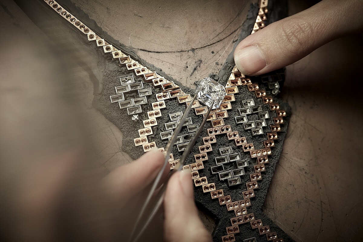 項鍊結合獅子和山茶花兩大品牌標記 ,同時展現女性力量與柔美特質。項鍊墜飾的梨形主鑽為可拆卸式設計,亦可組裝於套組的戒指佩戴。品牌非凡工藝使工作室在創作珠寶時可盡情發揮創意,不需採用一般標準的梨形切割鑽石,而是得以因應設計需求而去選擇優良品質鑽石,進而考量切割方式。此珠寶套組的項鍊與耳環中,便採用「垂墜」效果較為明顯的細長式梨形切割鑽石。創意,始終是香奈兒頂級珠寶的核心所在。 LION SECRET DIAMANT 可拆卸式項鍊 (獨一無二作品,全系列中單價最高之作) 18K白金,鑲嵌1顆重約15.55克拉DF L Type IIa梨形切割鑽石、1顆重約5.29克拉DI F Type IIa明亮式切割鑽石、2顆重約0.80克拉VVS明亮式切割鑽石及鑽石。 建議售價NTD 184,787,000元