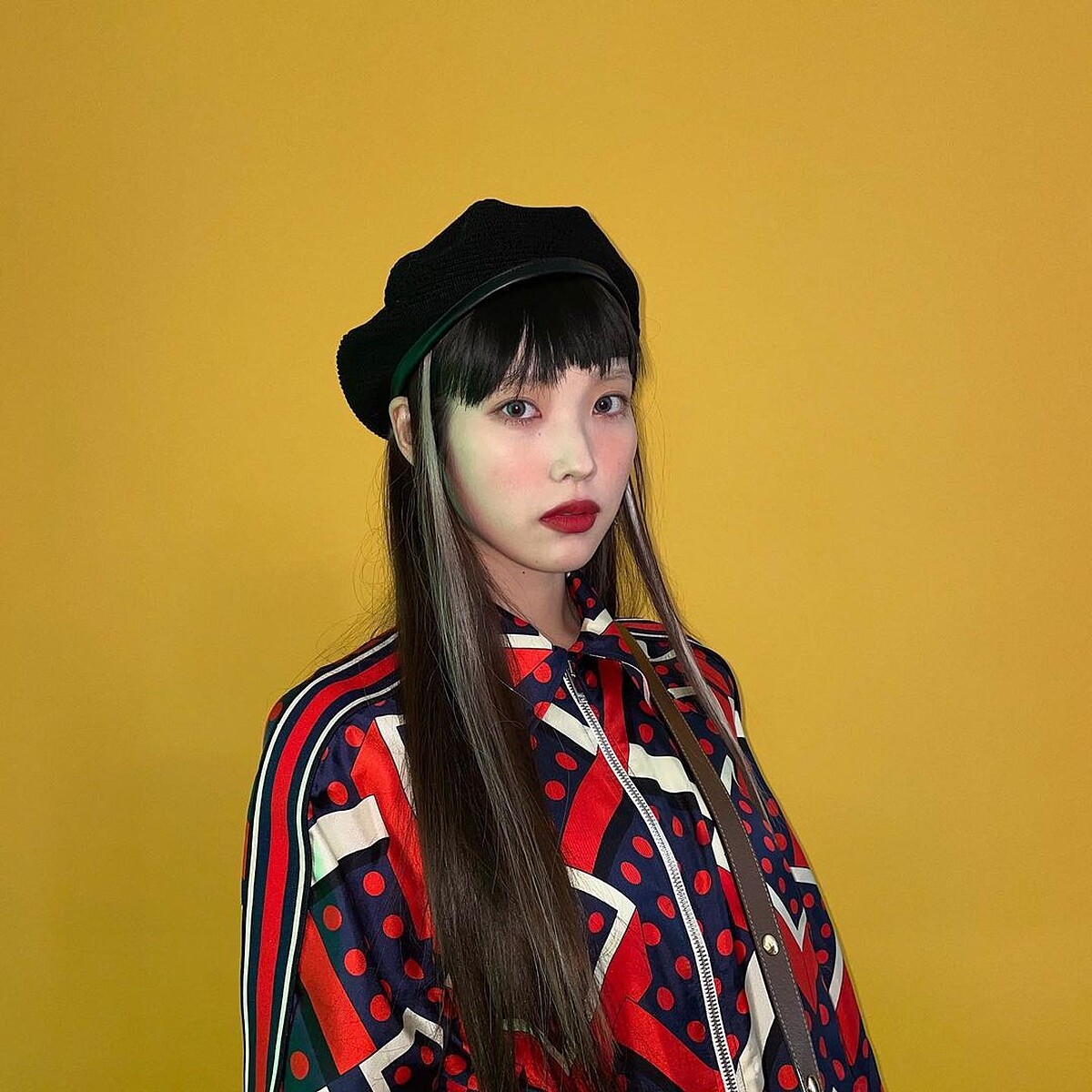 「國民妹妹」IU 身著印花運動外套,搭配黑色貝蕾帽,打破搭配框架,帶點英式味的碰撞新意。