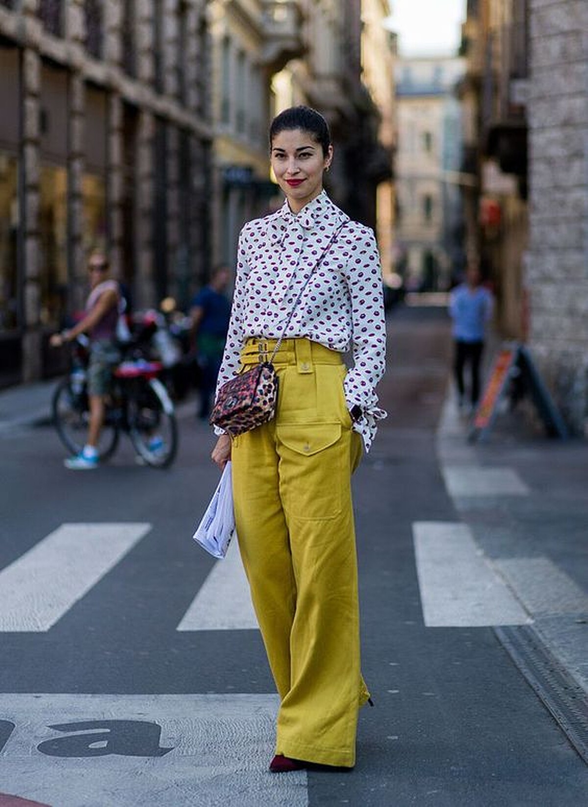 上身選用基本色調的印花襯衫,下身搭配今年流行的 Illuminating 亮麗黃色系褲裝,留意上窄下寬的比例配置,色塊式的聚焦眾人目光。