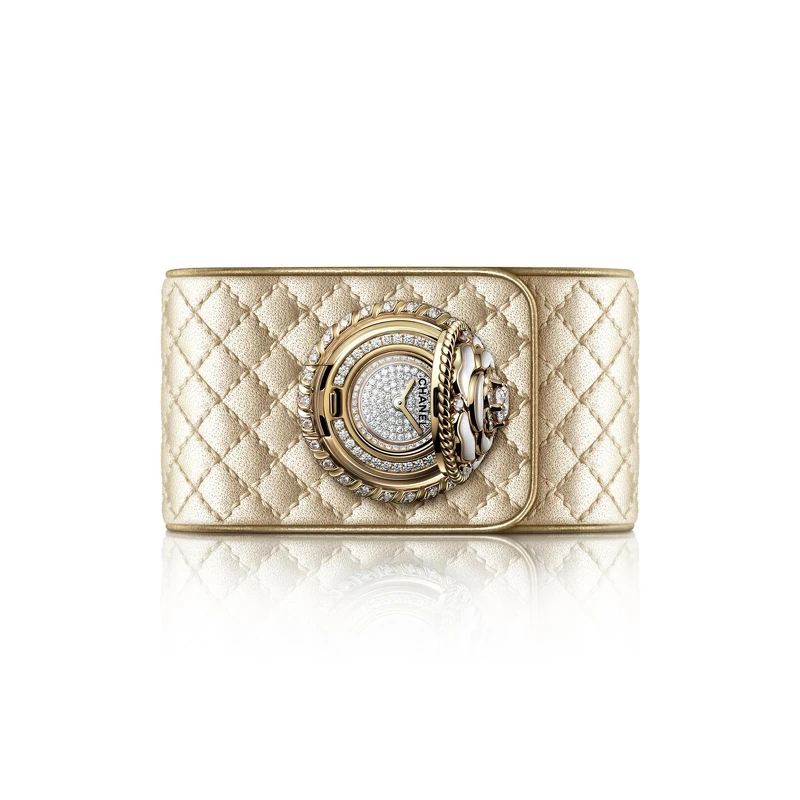 A.C.:Mademoiselle Privé 鈕扣腕錶系列展現 Chanel 高級製錶最女性化、神秘感的一面。我一直夢想著把經典的鈕扣元素運用在腕錶。透過香奈兒女士的巧手裝飾,平凡的鈕扣也能搖身一變成為珍貴物件。在展現不凡創意之時,同時不忘保留原本的功能。2021年鈕扣腕錶系列二部曲仍致力展現工藝。寬版錶帶的材質從斜紋軟呢改為菱格紋皮革,並飾以古銅色編織緄邊。我希望凸顯此系列與高級訂製服之間的連結,於是借重 Lesage 刺繡工坊的技藝,打造出佈滿金色圓珠的刺繡錶帶。鈕扣則以立體金獅為主角,四周鑲有一圈長階梯形切割鑽石,使這款作品更顯卓爾不凡。另外,我還想像將外套的衣袖裁下,只取其袖口與扣眼,接著便決定將鈕扣以珠寶作品來演繹。我設計了戒指形狀的底座並以鈕扣裝飾,在山茶花、拜占庭圖騰和香奈兒女士的側影點綴下,隱藏著最神秘的腕錶。