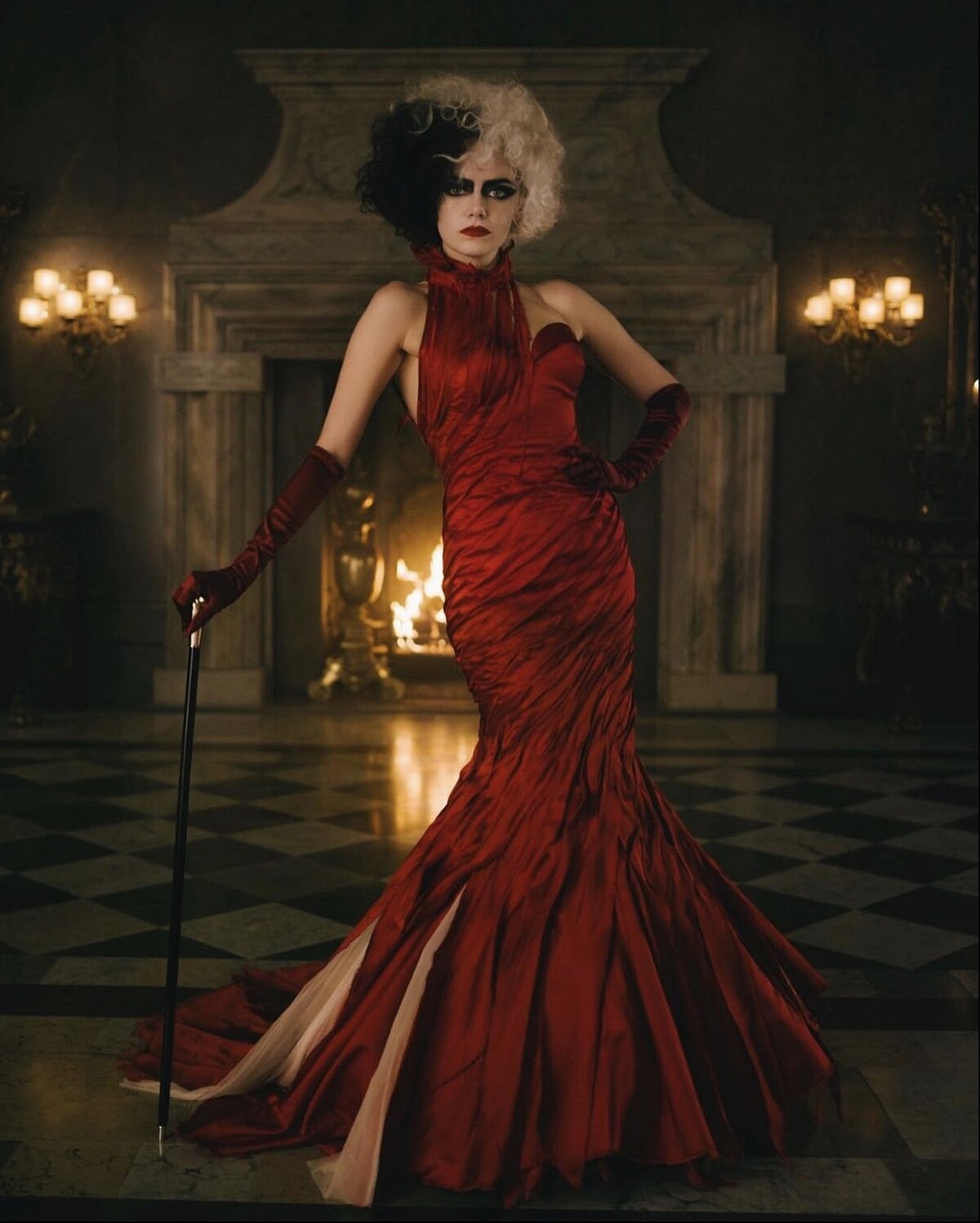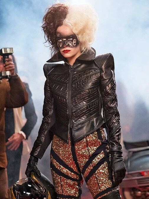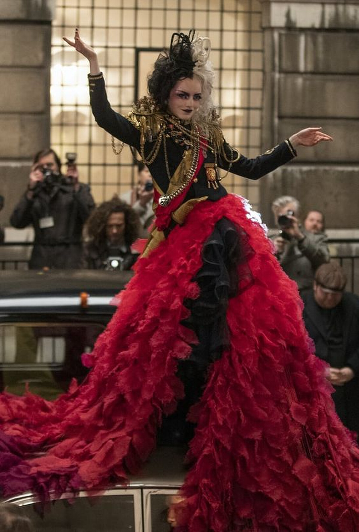 接著看到的,也是劇中我最喜歡的一套造型,隨著劇情發展到了時裝設計爭霸戰中後期,Cruella 在她的勁敵男爵夫人原本在車中想要華麗亮相,下車奪取媒體目光的那一刻,直接踩在男爵夫人的車上,用時尚女王的姿態,頭戴黑白王冠(由她的標誌性髮色編織而成)身著閃閃發光的軍裝,鍊條、勳章掛滿展現極致的龐克元素。