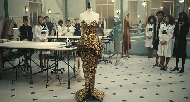 接著是這套金色蟲蛹裝,雖然 Cruella 沒有真正地將它穿在身上,但也與 Alexander McQueen 2001 年夏季系列以蝴蝶衝破開場的一幕似曾相似。這套造型看似奢華亮麗,背後所蘊含的實則是滿滿對男爵夫人的報復與諷刺。
