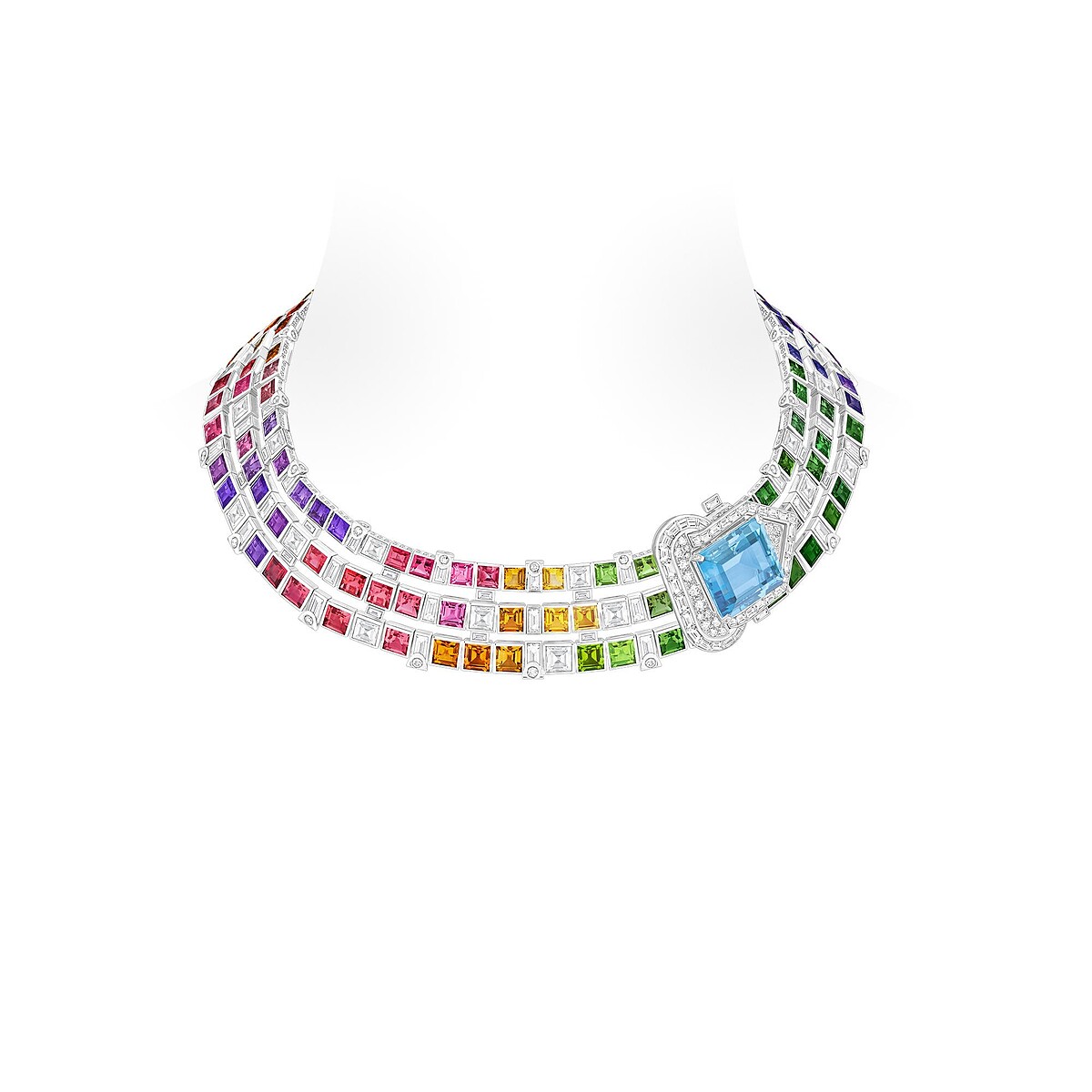 F.A.:「Le Tumbler 」項鍊。我們將 Vuitton 先生發明的鎖釦設計轉化成項鍊上的重要裝飾,項鍊以多層次結構打造,並配置多種色彩的寶石。最困難的部分是我希望鎖釦不只是裝飾用,而是有實質的功能性,但同時又要確保項鍊不會因其重量而有所傾斜。討論與製作過程相當繁複。