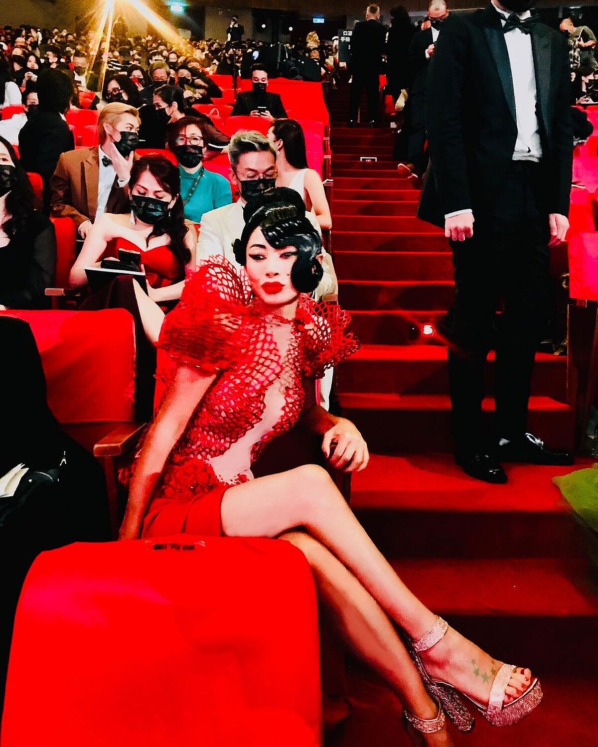 除了不老媚姨,你對白靈的印象,應該還包含性感女王一詞,在去年金馬57以紅色縷空禮服出場,一路開到肚臍的深V造型加上險露三角地帶的開高衩設計,大膽又愛露的穿衣風格,早就深深烙印在全台戲迷腦中,更別說佔據自己社群平台的性感穿搭照片。