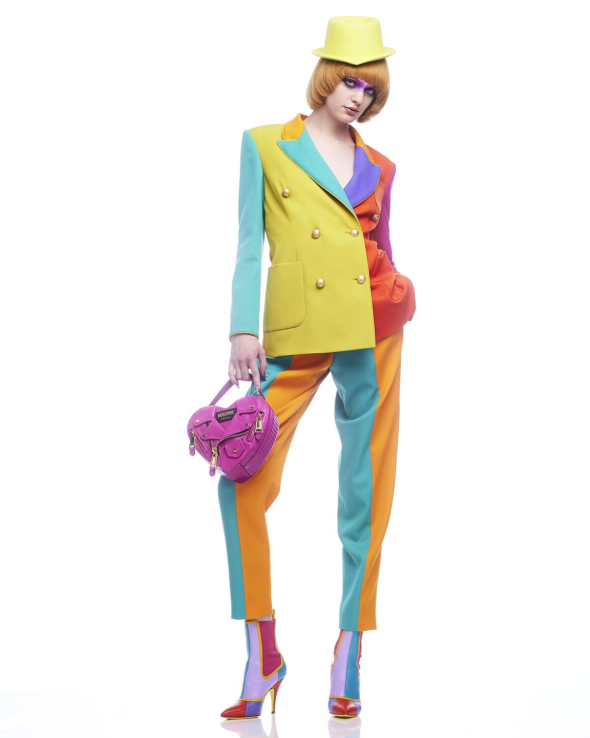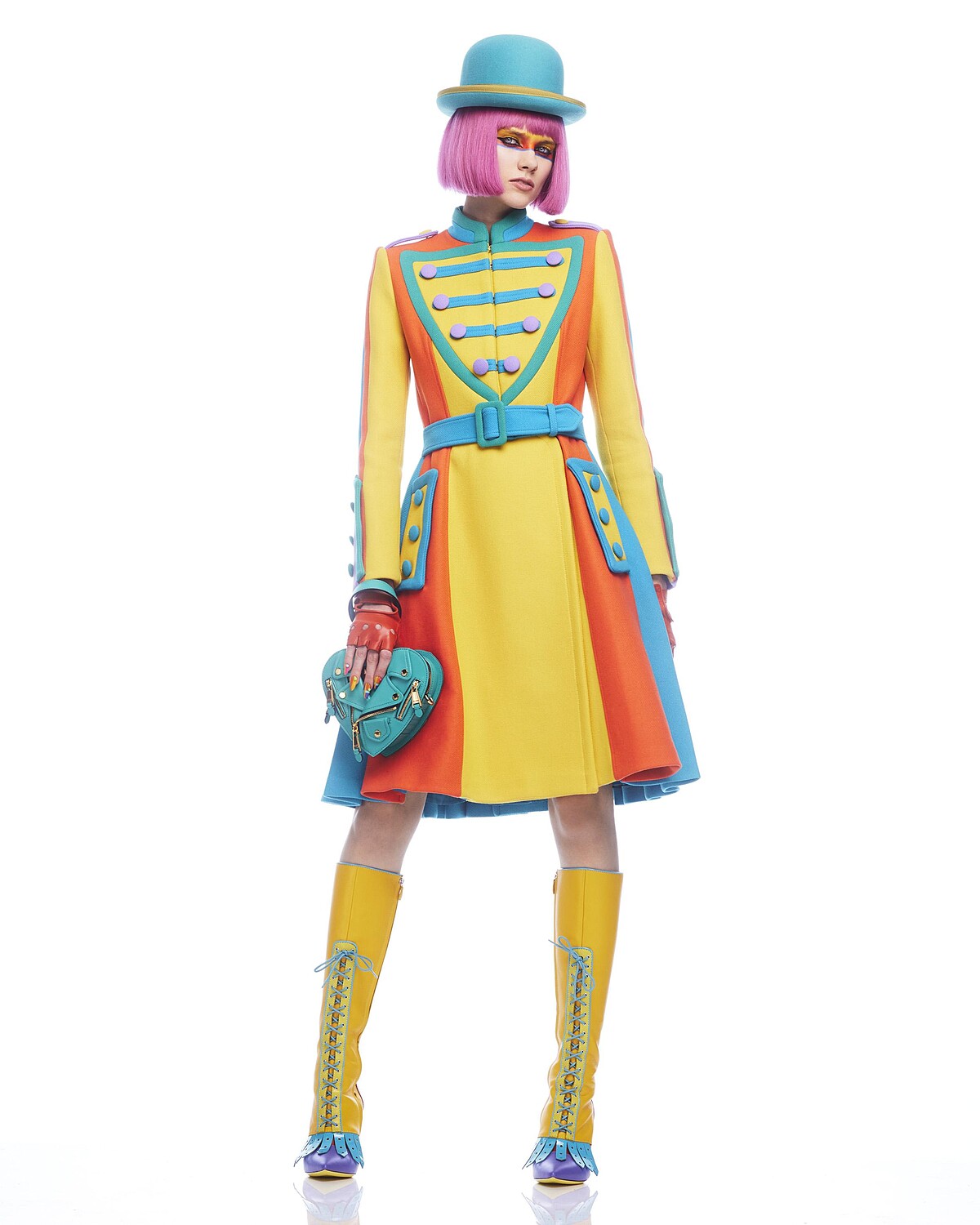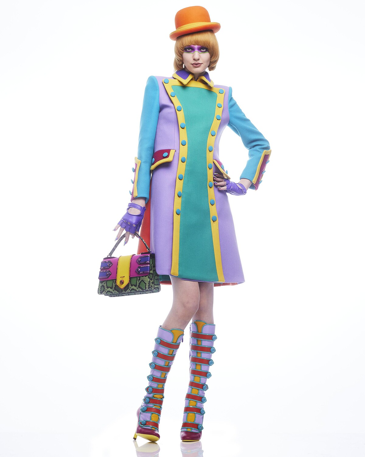 圓頂禮帽染成薰衣草紫、探戈橘與太空藍,彷彿《發條橘子》中主角所配戴的標誌性禮帽,復古航空制服與方間設計讓人聯想到當時六、七○年代對未來的美好想像。