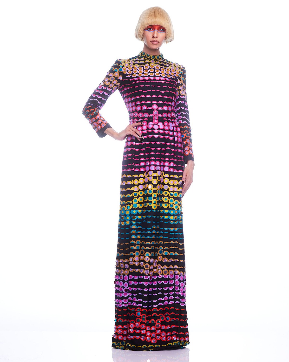 而華麗感更強的晚宴長洋裝、披肩翻領燕尾服和束腰外套式洋裝則展現了更錯綜複雜的色塊,凸透鏡般的想像,讓歐普藝術與普普藝術也巧妙融入,彷彿電視雜訊般的迷幻深刻。