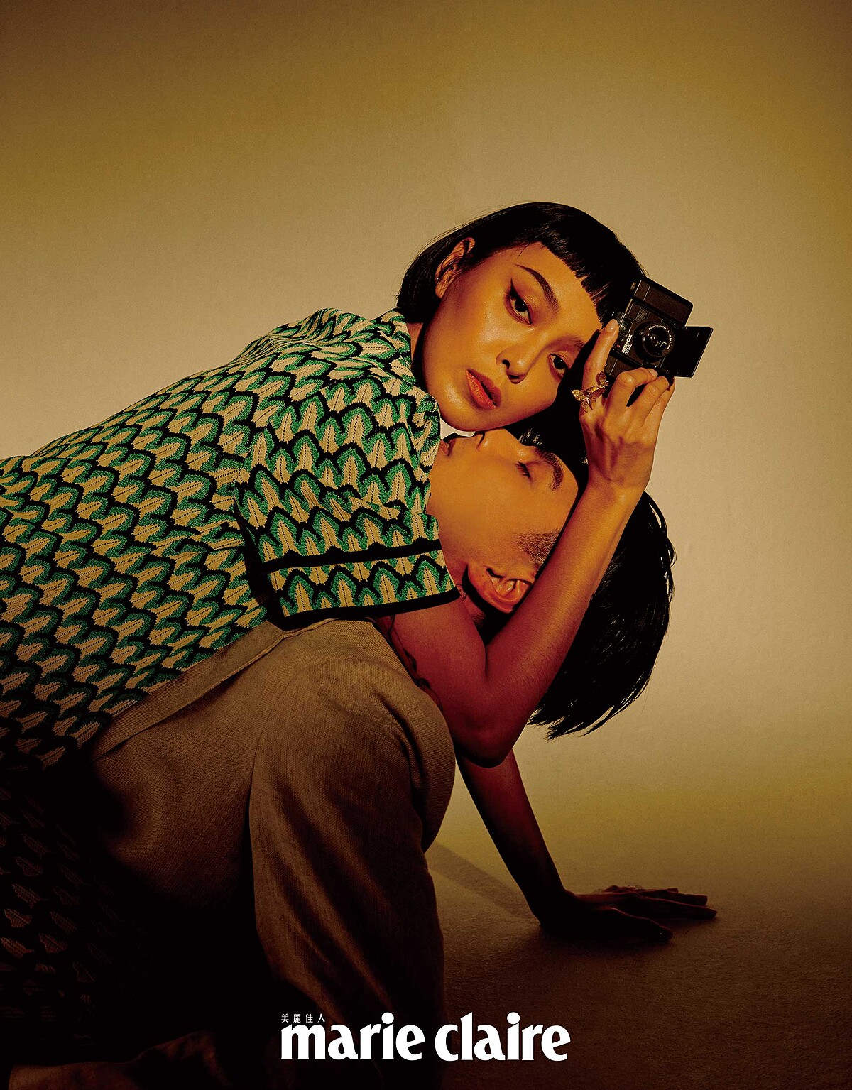 Jun:米色西裝外套,Sandro。 Kiwi:綠色印花襯衫、綠色印花長褲,both by Sandro;金色戒指,Dior。