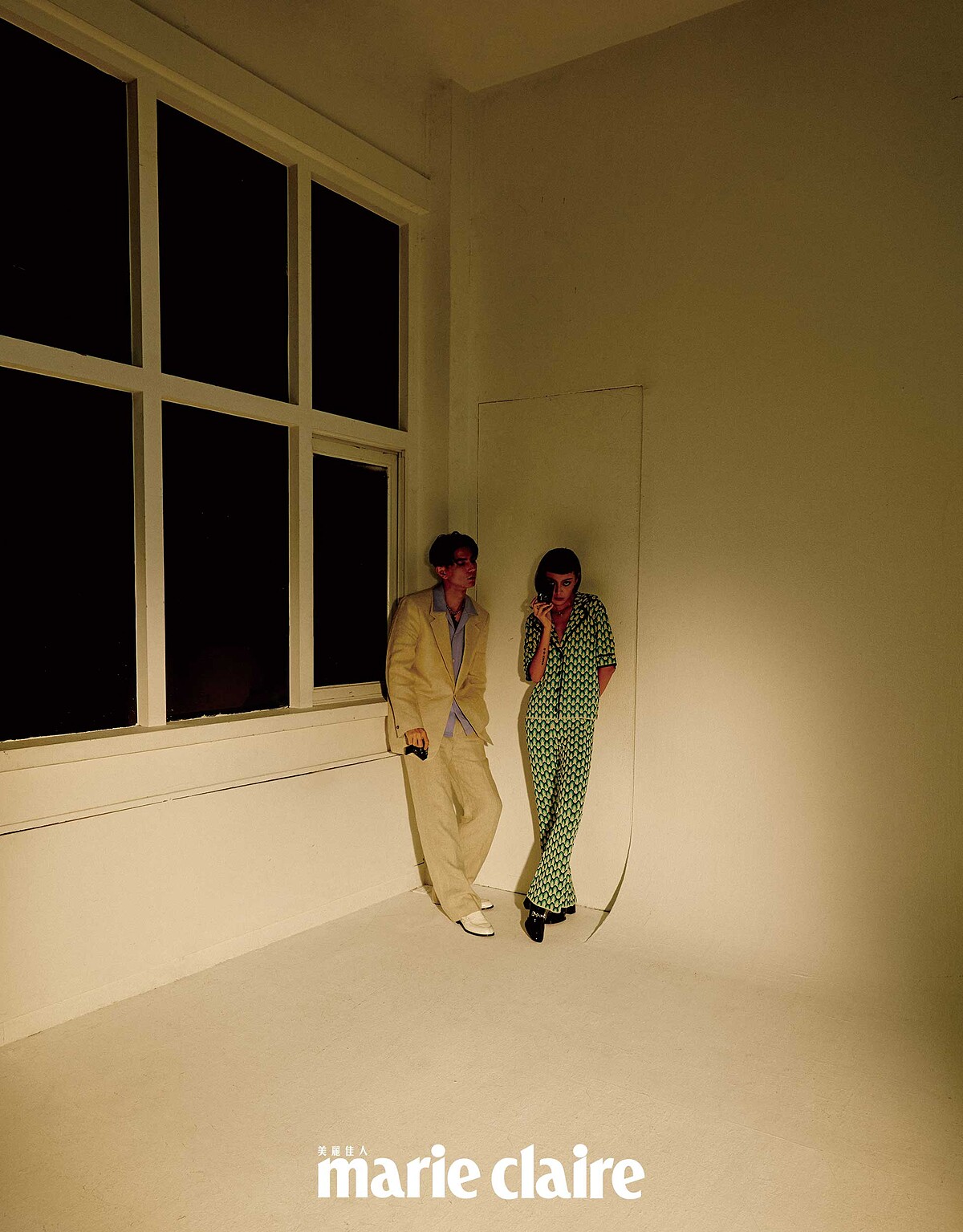 Jun:米色西裝外套、米色西裝長褲、紫色開領襯衫,all by Sandro;金色項鍊,Dior;白色樂福鞋,Christian Louboutin。 Kiwi:綠色印花襯衫、綠色印花長褲,both by Sandro;黑色皮革短靴,Christian Louboutin。