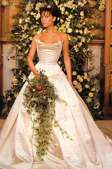 提及身穿Vera Wang出嫁的女星,Victoria Beckham絕對是經典中的代表。帶有奶白色光澤的緞面禮服,婚紗的上半身為馬甲式的緊身設計,下半身則為夢幻的澎裙輪廓,經過了20多年的時光再回頭欣賞,依舊能撩起女孩們想穿上它的慾望。