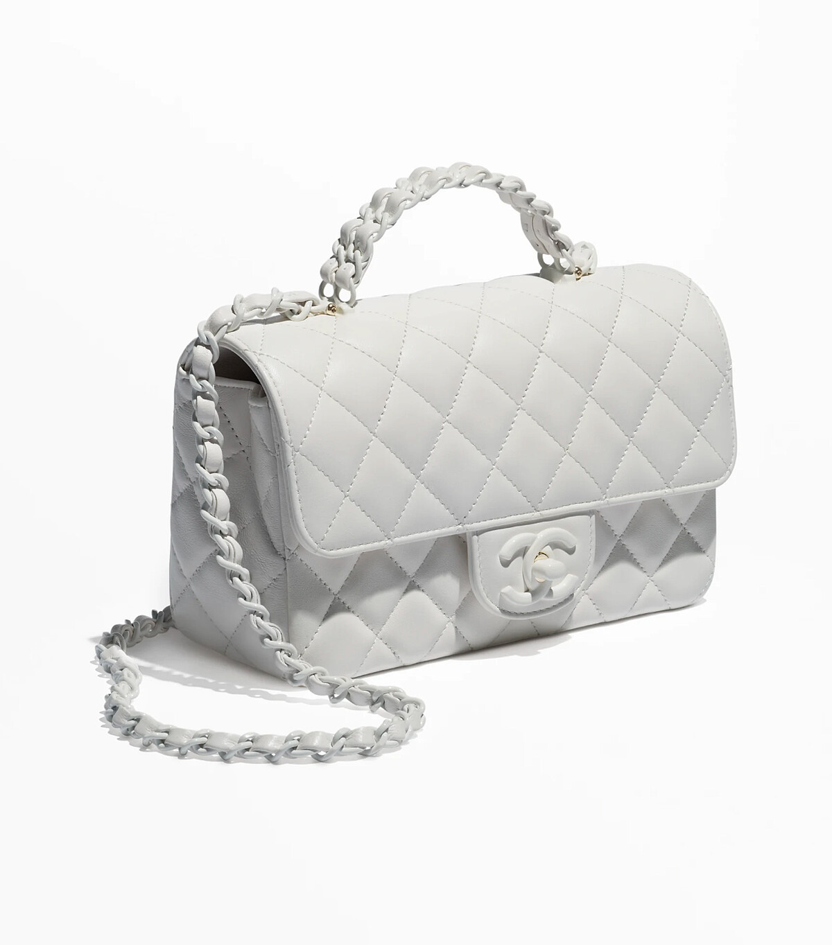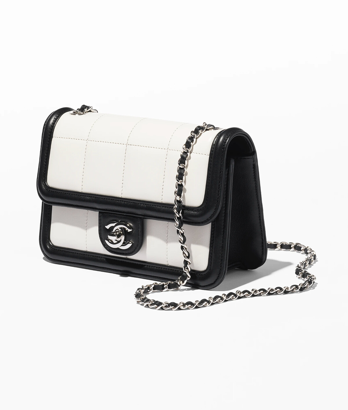 這款以小羊皮、小牛皮、漆皮金屬而製成的白色滾黑邊的迷你口蓋包,同時擁有香奈兒最經典黑與白,推薦喜歡經典款式的你。