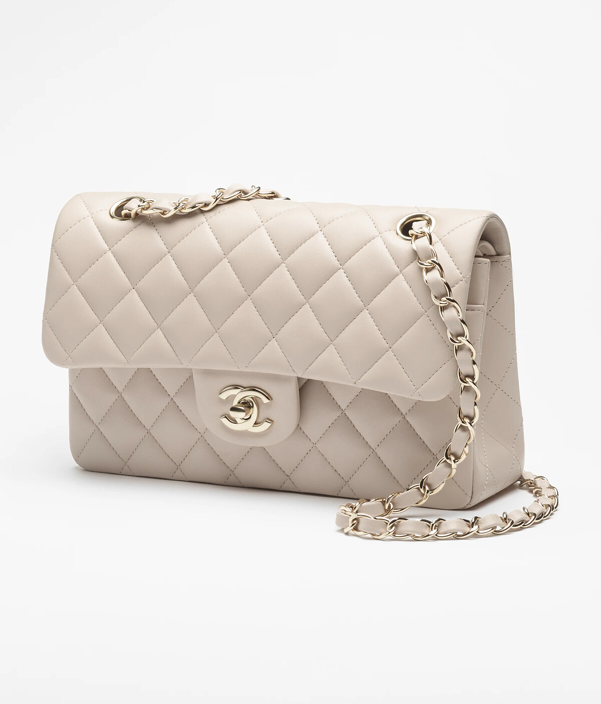 淡米色的經典小型口蓋包,以小羊皮搭配金色的金屬鍊帶,優雅、淑女又時髦的顏色,無論你是裙裝、褲裝,日常或是派對,都可以輕鬆搭配。