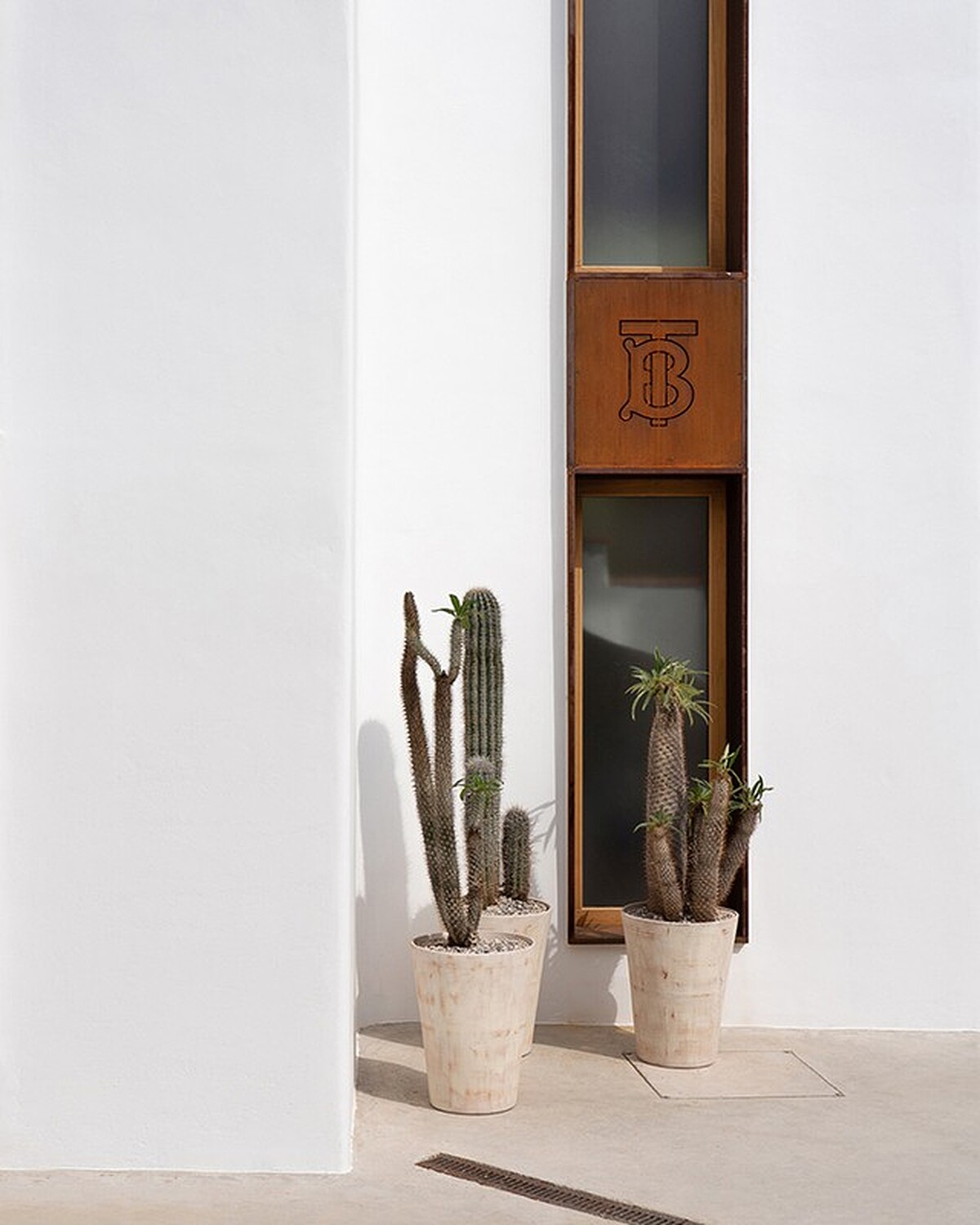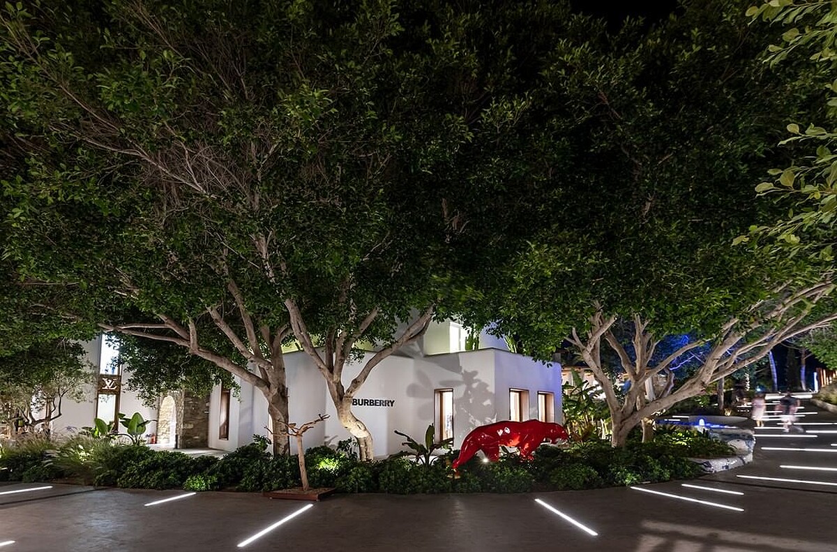 俐落的柱體建築,品牌選擇用TB押花字作為招牌。而在Riccardo Tisci任上後,Burberry多了一分狂野不羈、冒險精神,呼應這樣的品牌新生命,店外以熱帶風格的植栽為主,並佇立著一隻惹眼的紅色豹身雕塑,別具特色。