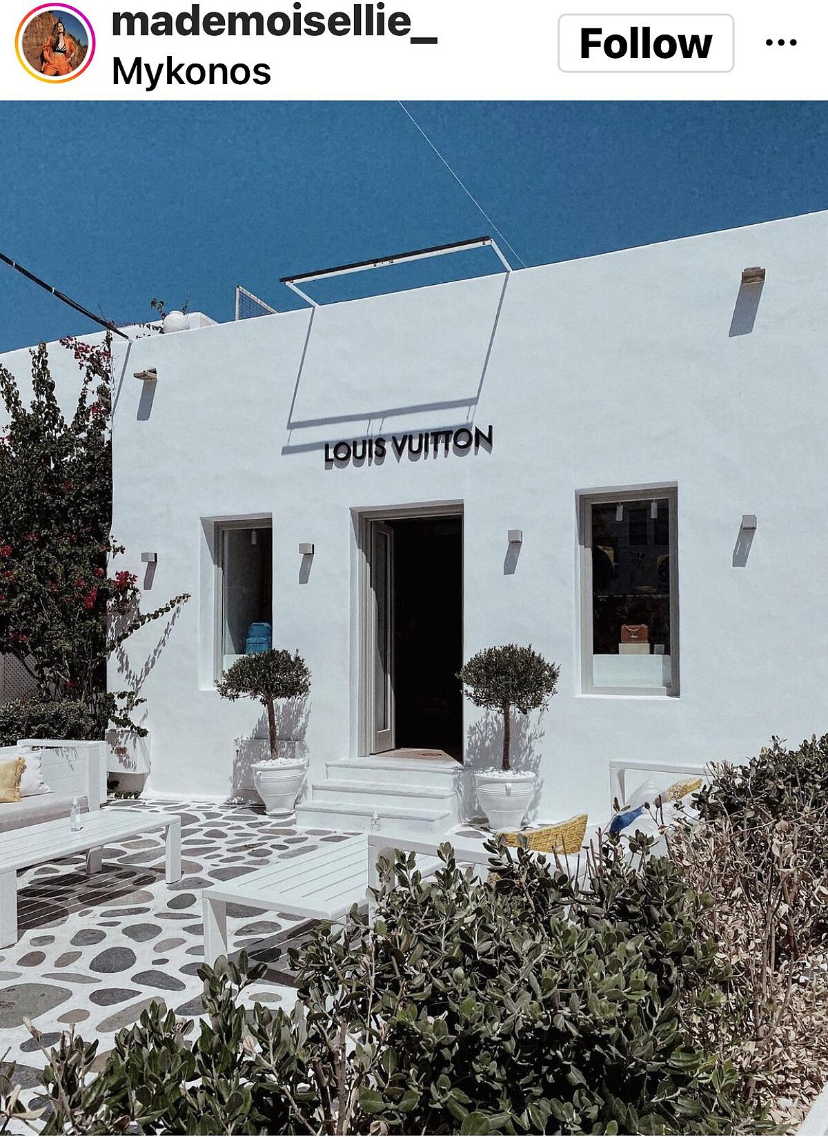 與Burberry為鄰,Louis Vuitton同以極簡的幾何線條打造店舖外觀,店門口乾淨潔白的粉刷,搭配著全白色的傢俱佈置,加上部分的綠色植栽點綴。除了店門口的白牆,左手邊的粉紅花牆也是此處熱門的拍照背景。