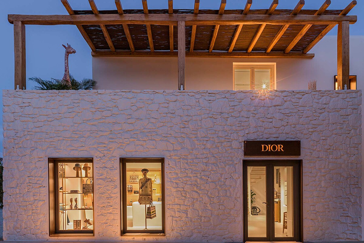 從快閃店變成常駐商店,Dior以石砌外牆營造出異國情調,二樓搭起木+草蓆製成的遮陽露台,並以自家的印花動物雕塑品作為裝飾,從遠處看便能一眼視出Dior的品牌標誌。