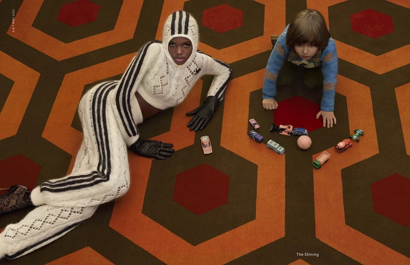 《鬼店》被稱為史上最恐怖的電影,令人不寒而慄、裝飾的印花壁紙與普普風圖紋地毯的長廊、陰魂不散的藍衣小女孩、青綠色的浴室、騎三輪車的小男孩,全在 Exquisite Gucci 形象廣告重現,Alessandro Michele 以瑪丹娜在90年代穿過的造型為靈感而設計的紅色洋裝,在哥德風的場景中成了最像鬼魅的存在,而白色針織運動套裝則像幽靈,不只出現在237號套房,而是無所不在!