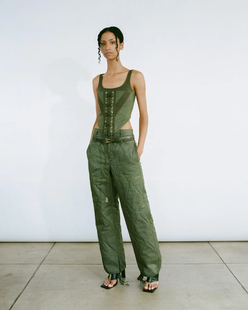 工裝褲也是Dion Lee另一項必敗單品,縮口或五金抽繩等細節處理,讓寬鬆剪裁的工裝褲在提供穿著得舒適度外,也兼具時尚態度,是打造Y2K風潮不可或缺的單品。