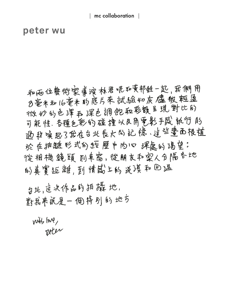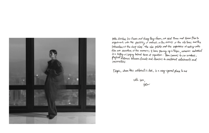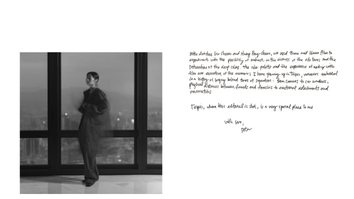 時尚經歷豐富、涉獵廣泛且想法極多的他選定「台北」做為創作主題,並邀請兩位藝術家導演林君昵與黃邦銓一同參與,「以8毫米和16毫米的底片來試驗如灰燼般輕盈微妙的色澤和深色調飽和彩韻呈現對比的可能性,各種色彩的碰撞以及用電影手感執行的過程,喚起了我在台北長大的記憶,這些畫面根植於在抽離形式的經歷中,內心深處的渴望:從相機鏡頭到車窗,從朋友和家人分隔各地的真實距離,到情感上的淡漠與回溫。」他如此解釋這次的創作過程。