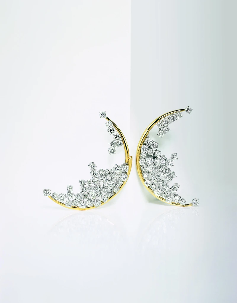 這是不容易回答的問題!因為每件珠寶代表著一種特殊的情感,一種永恆的記憶。我父親總是說,成為一名珠寶商是世界上最好的工作,因為珠寶與生活中難忘的場合之間的這種關係。我們有幸陪伴人們完成他們最重要的成就和特別活動。但是,這也是一項重大責任。珠寶商必須盡最大努力確保他們製作的珠寶與他們慶祝的時刻一樣完美,就好像他們是穿戴者提醒的那一刻“非常美麗”的守護者。這就是為什麼我喜歡各種珠寶的原因,因為它們都與特殊的時刻,與特定的情感有關。這裡要提一下,我覺得自己與1996年推出的藍月亮耳環有著非常密切的關係,其中一個原因是這些耳環獲得了鑽石國際獎(被認為是珠寶界的奧斯卡獎)。新月形,這個極其古老的金匠圖案,顯然是一個獨一無二的象徵。 這些耳環的設計靈感源自「珠寶如夢」的主題。黃金金屬部分飾有月亮輪廓,閃耀著13.9克拉的鑽石。它們鑲嵌在白金中,在虛空中產生懸浮效果。對齊的不規則性僅是顯而易見的;事實上,排列在不同的平面上有助於創造一種光影效果,讓人想起月球斑點,並暗示一個抽象的深度概念。特別的耳環開合延續了耳垂後部的圖案。這決定了一種神奇的效果,顯然與物理定律相悖,但將珠寶的靈感重述為夢想。