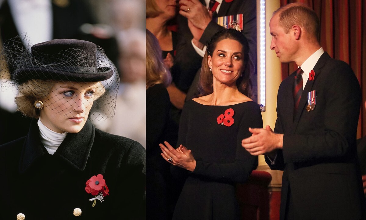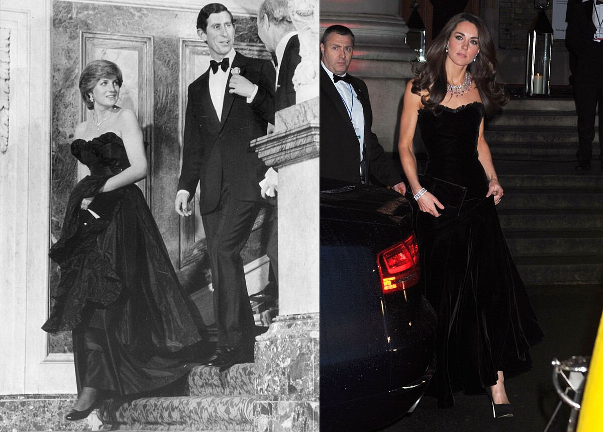 1981年,黛安娜王妃才20歲,協同(當時的)查爾斯王子出席自己人生的第一場正式社交場合,年紀雖輕,卻把性感的心型領黑色禮的氣勢完美展現;30年後的凱特王妃選擇了一件剪裁相似,不過是天鵝絨材質的禮服,出席《太陽報》所舉辦的士兵表揚典禮。