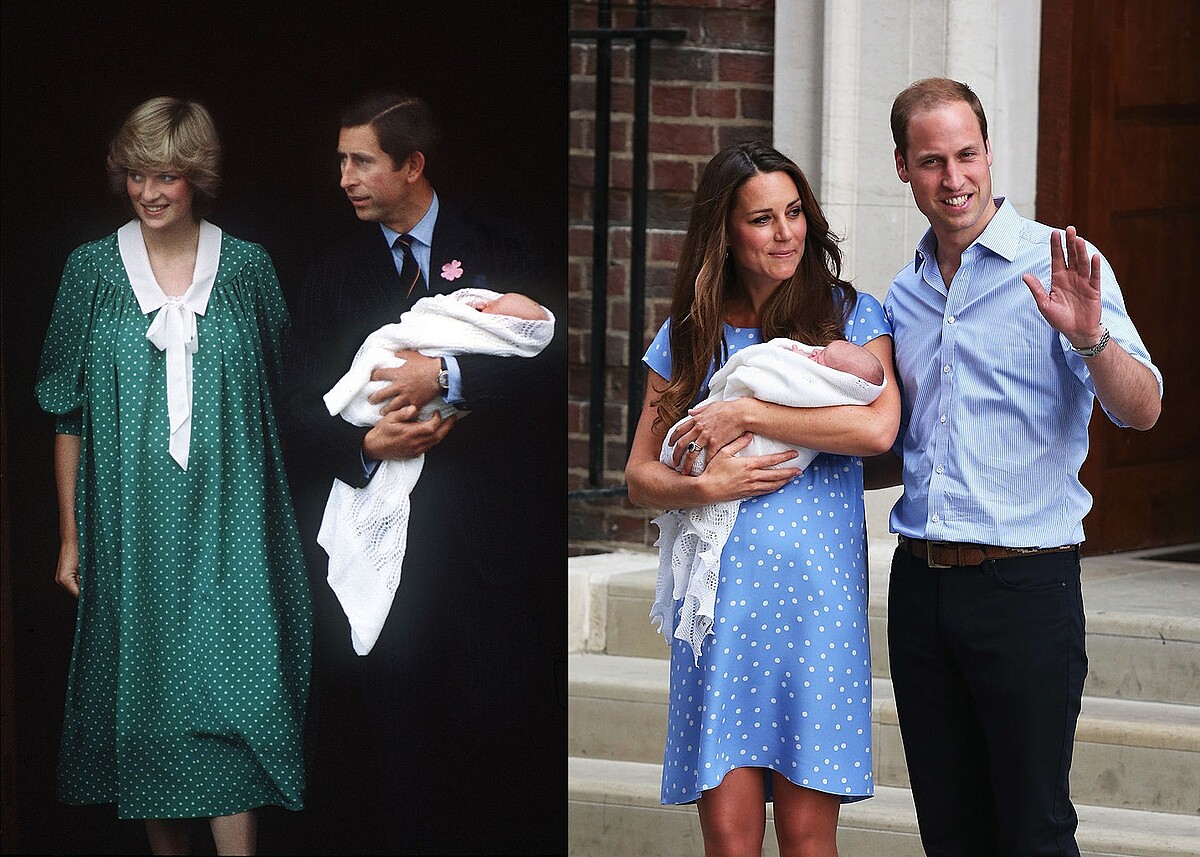 點點的印花經常受到黛安娜和凱特青睞,1982年威廉王子剛出生,黛安娜王妃選擇了一件寬鬆的綠色點點洋裝來遮遮尚未復原的孕肚;而凱特王妃抱著喬治王子首亮相的時候,則是一件寶寶藍的點點短洋裝。