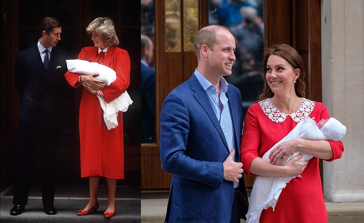 接著輪到哈利王子出生,當時黛安娜王妃選擇了一件顯氣色的紅色大衣亮相;快轉至2018年路易王子出生的時候,因爲當時時節為春夏之間,凱特王妃穿的是一件紅色洋裝,白色蕾絲領口細節作為點綴。