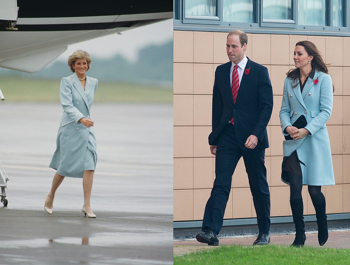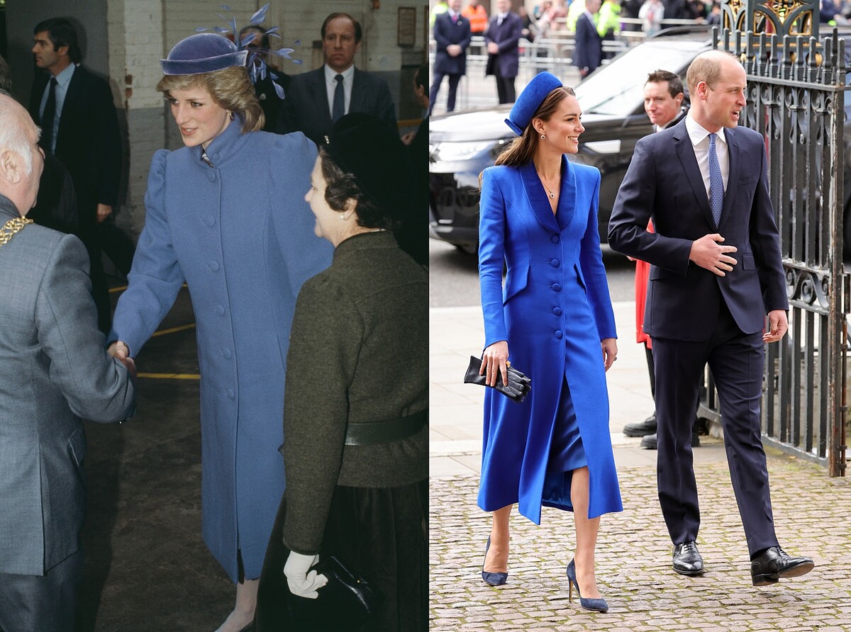 霧霾藍襯托出黛安娜王妃的白皙皮膚,搭配是一頂天鵝絨+羽毛裝飾的禮帽,富饒細節和造型感;一樣是一件大衣是的長洋裝,凱特王妃則是選擇較為飽和到寶藍色,同色系的帽子,搭配的高跟鞋則帶點灰調的莫蘭迪色系。