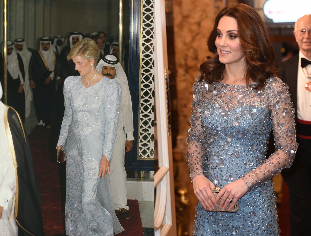 Catherine Walker可以說是當時黛安娜王妃的愛牌,多次穿著該排的訂製禮服出席晚宴,細緻的水晶光采反映出黛安娜王妃的可人氣質。凱特王妃則是在前幾年的皇家大匯演選擇相似的設計。