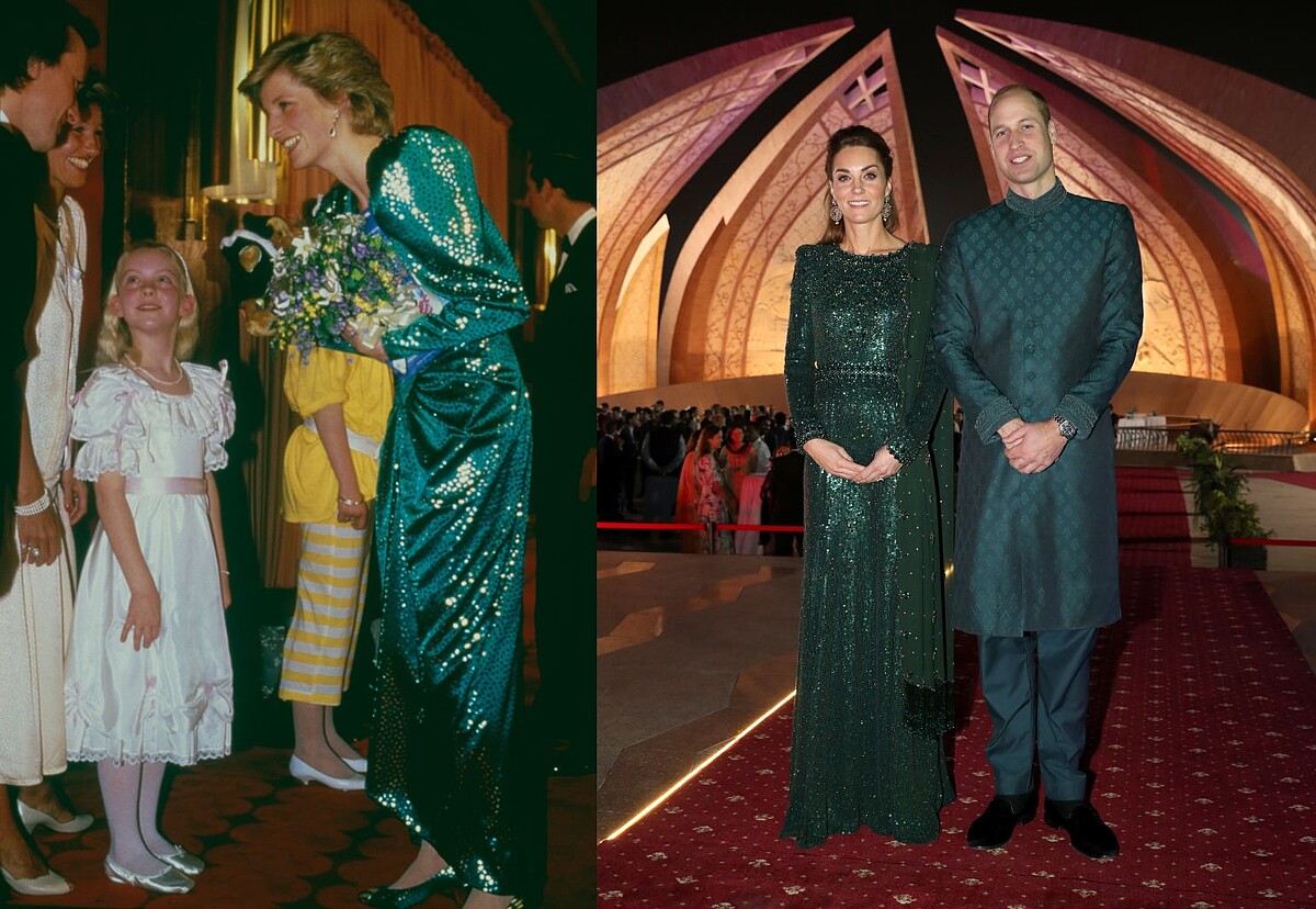 祖母綠的亮片洋裝來自Catherine Walker,戴安那王妃穿著出席電影《Biggles》首映會;2019年到訪巴基斯坦,凱特王妃取經高貴氣質的祖母綠亮片元素,轉化為當地的傳統服裝造型。