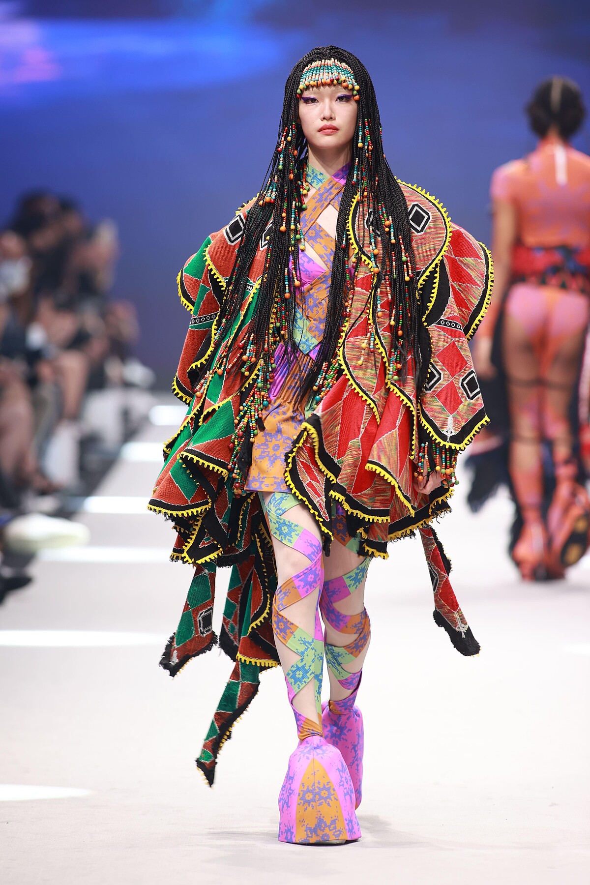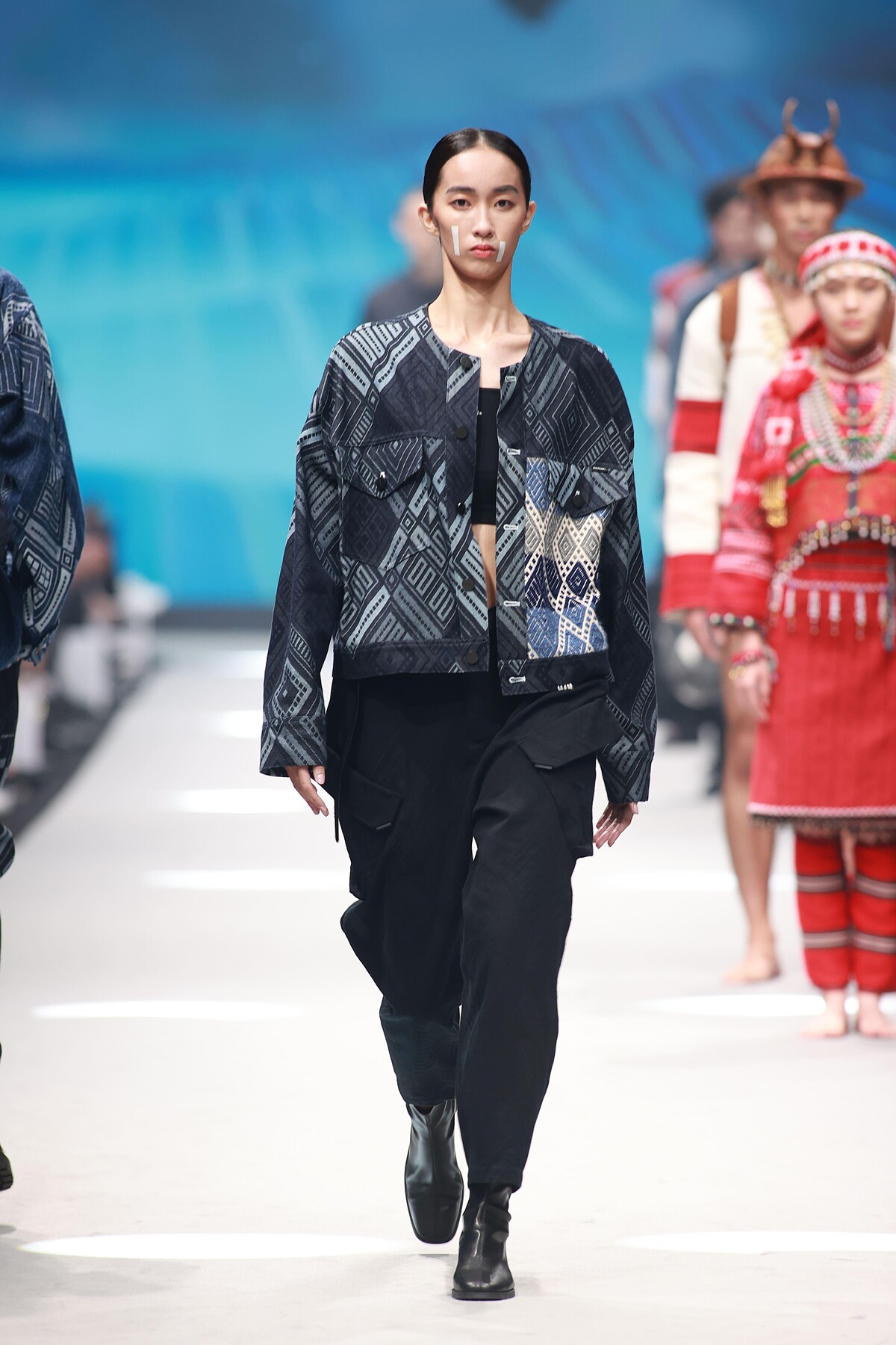 開幕秀上精彩盡出,JUST IN XX設計師周裕穎克服了無法將具有教學傳承品價值的排灣族刺繡片拆解縫製的限制,一方面以高難度的拼接方式保留了既有的布片結構,另一方面也與織機器廠合作,找出讓此種織物規模化的生產的可能性。秀場上呈現大量運用排灣族「百步蛇」圖騰設計的鮮豔服飾,充滿了青春的活力,讓人看到傳統新生的可能性。