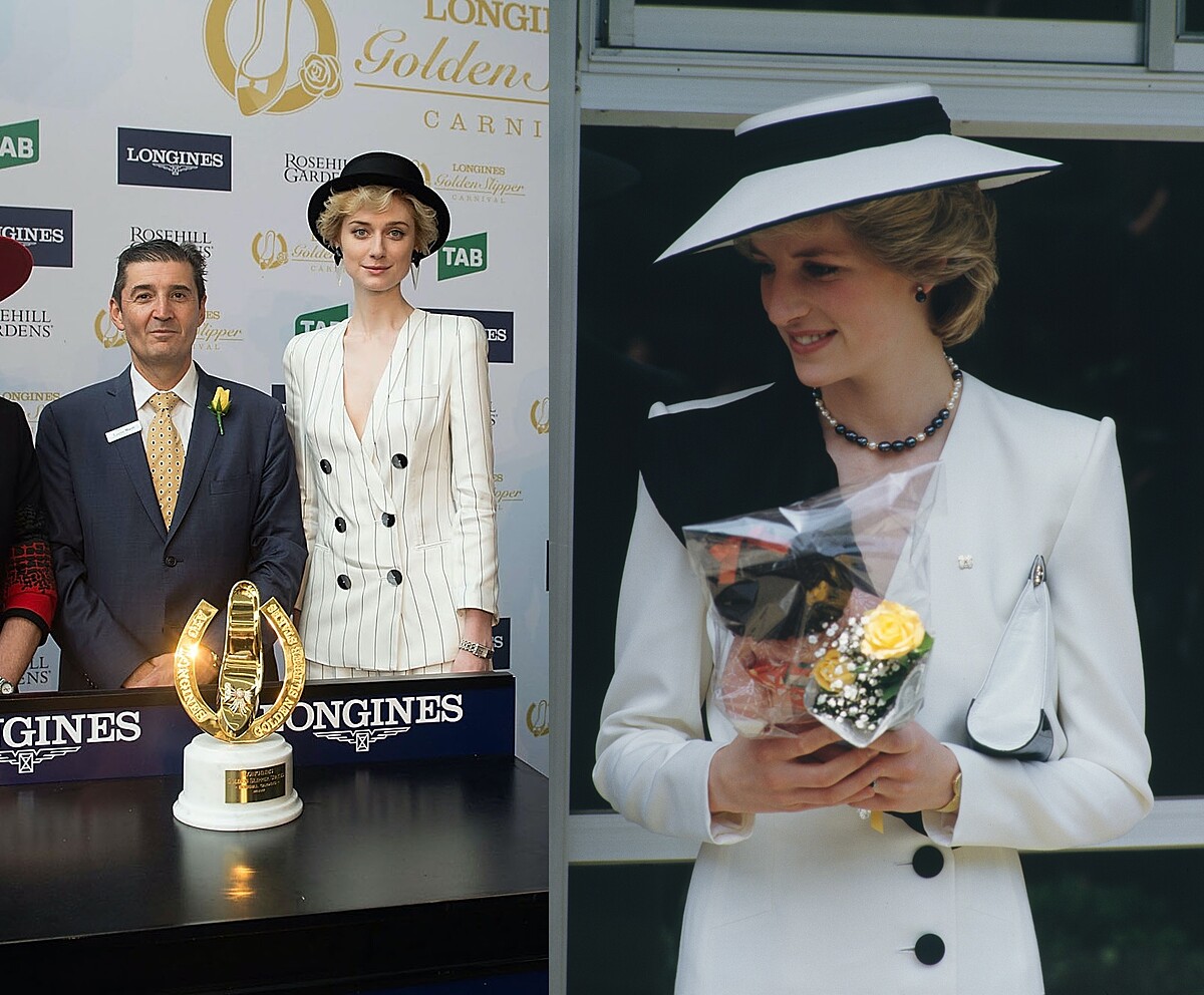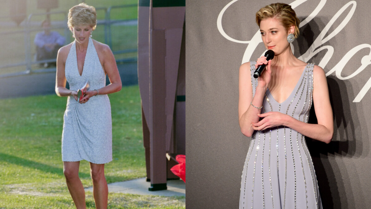 除了在戲內重新復刻了黛安娜王妃的水藍色洋裝造型,在2018坎城影展的一場記者會上,Elizabeth Debicki一襲低胸晚禮服的色調與水鑽細節也非常神似黛安娜王妃。當年王妃選擇搭配的是墜式的耳環、Elizabeth Debicki則是選擇顯眼的圓形鑽石耳環。