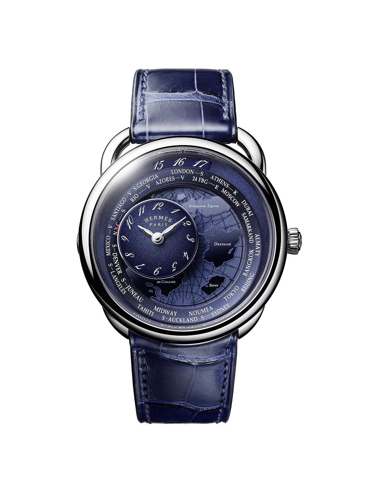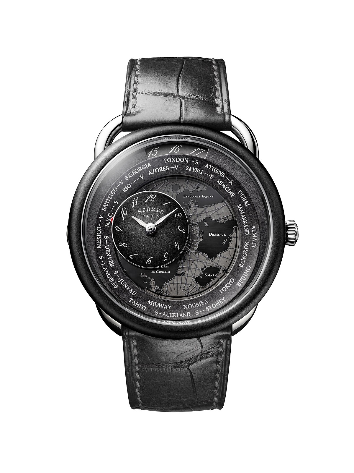 Arceau Le temps voyageur 漫遊時光腕錶以同款不同材質與錶徑尺寸(41mm鈦金屬與38mm精鋼),一舉斬獲年度最佳複雜男、女錶頭銜,寫下另類歷史紀錄。外觀風格耐看之外,Hermès 的腕錶功能設計自有一套,本次把世界時區轉化為漫遊全球的想像-只要按下位於九點鐘方向的按把,就能啟動特殊機制,衛星錶盤即會轉至設定時區城市顯示當地時間,家鄉時間則於12點鐘方向讀取。