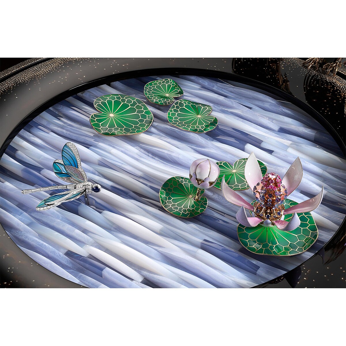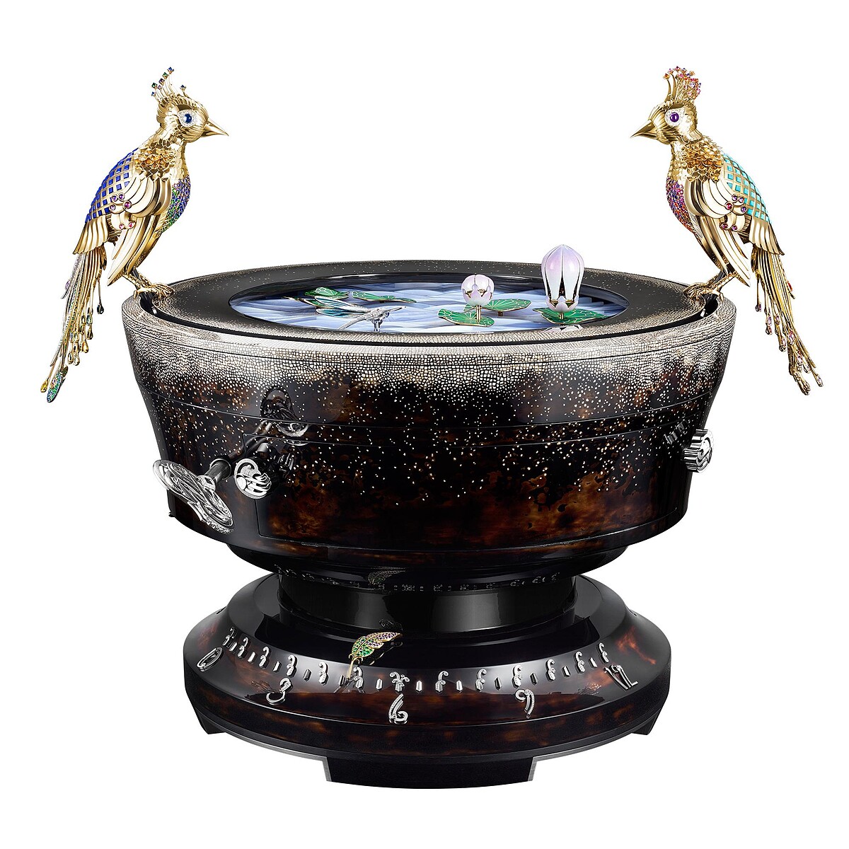 今年GPHG首度新增的最佳機械鐘獎項,由 Van Cleef & Arpels 融合珠寶工藝與複雜功能的 Fontaine Aux Oiseaux Automaton自動機械裝置拿下。大約高44寬41公分的作品,備有逆跳時針及分針與8日動力儲存,最讓人驚艷的動態裝置,由各種金工與寶石裝飾技藝打造,活靈活現的鳥兒、波動的水池、嬉戲於荷花池裡的蜻蜓,隨著自動機械裝置的啟動,即在眼前伴隨著樂音上演一場生態美景。