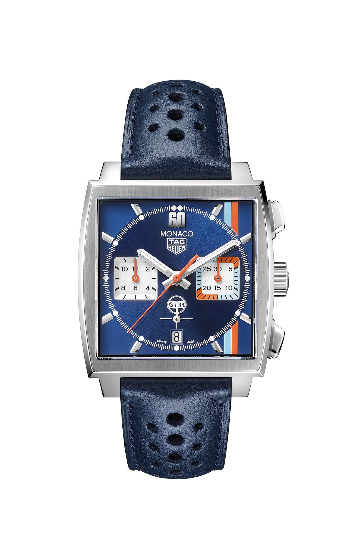 2022年版本 Monaco Gulf 特別版腕錶的靈感,來自品牌致敬摩納哥古董車大獎賽,與聯盟夥伴 Gulf 海灣石油曾推出之聯名款;承襲製錶史上首款方形防水錶殼的自動計時碼錶 Monaco,以及 Gulf 聯名錶的用色、配置等經典元素,內在則是首度搭載全新機芯,是經典兼具現代的嶄新組合。