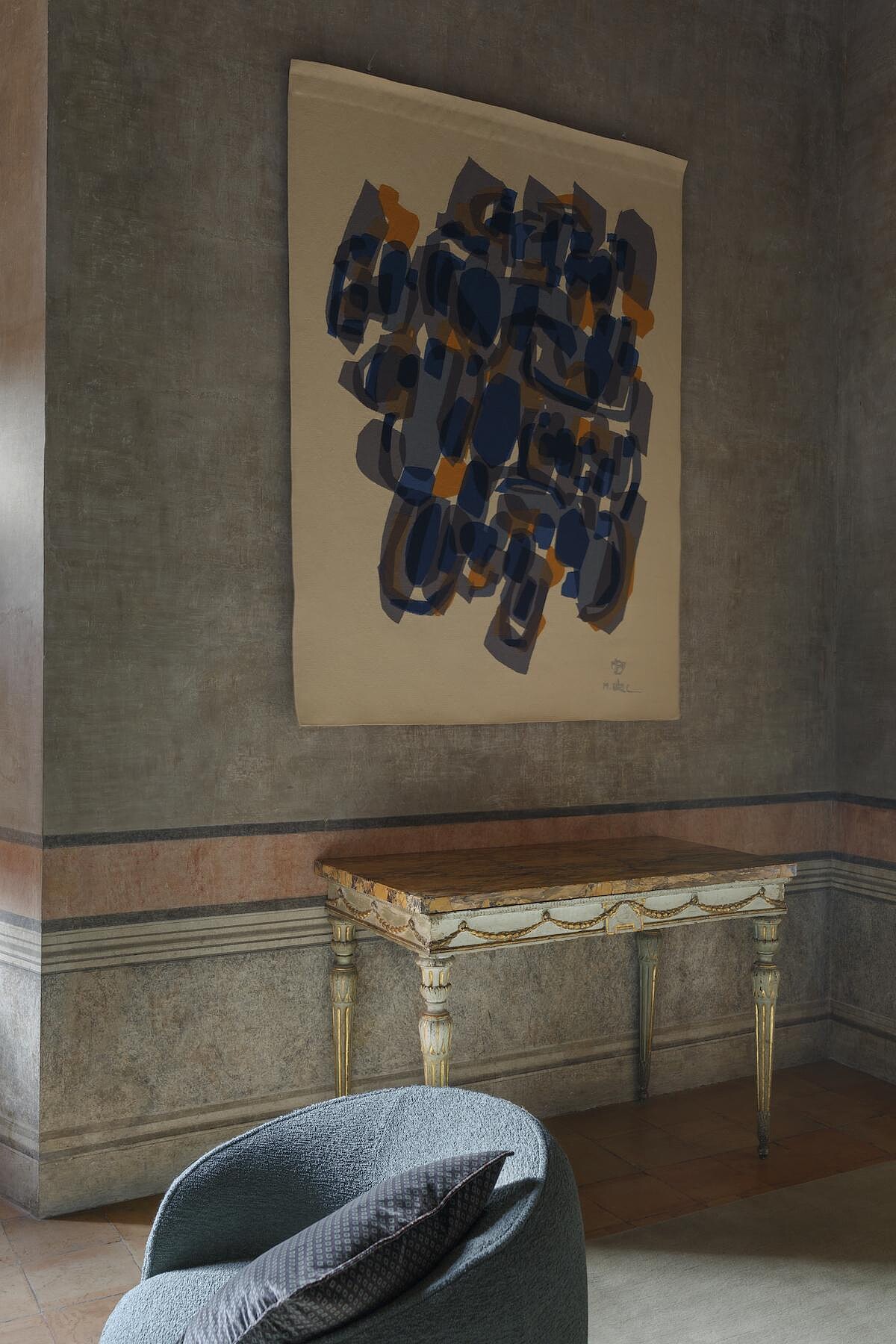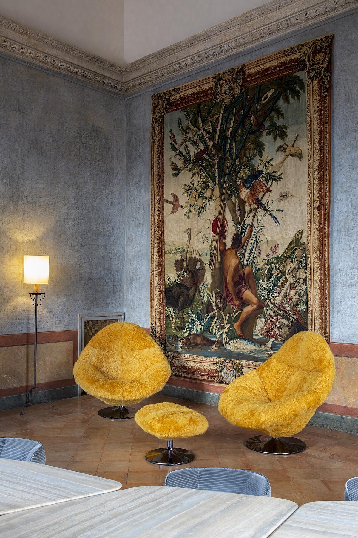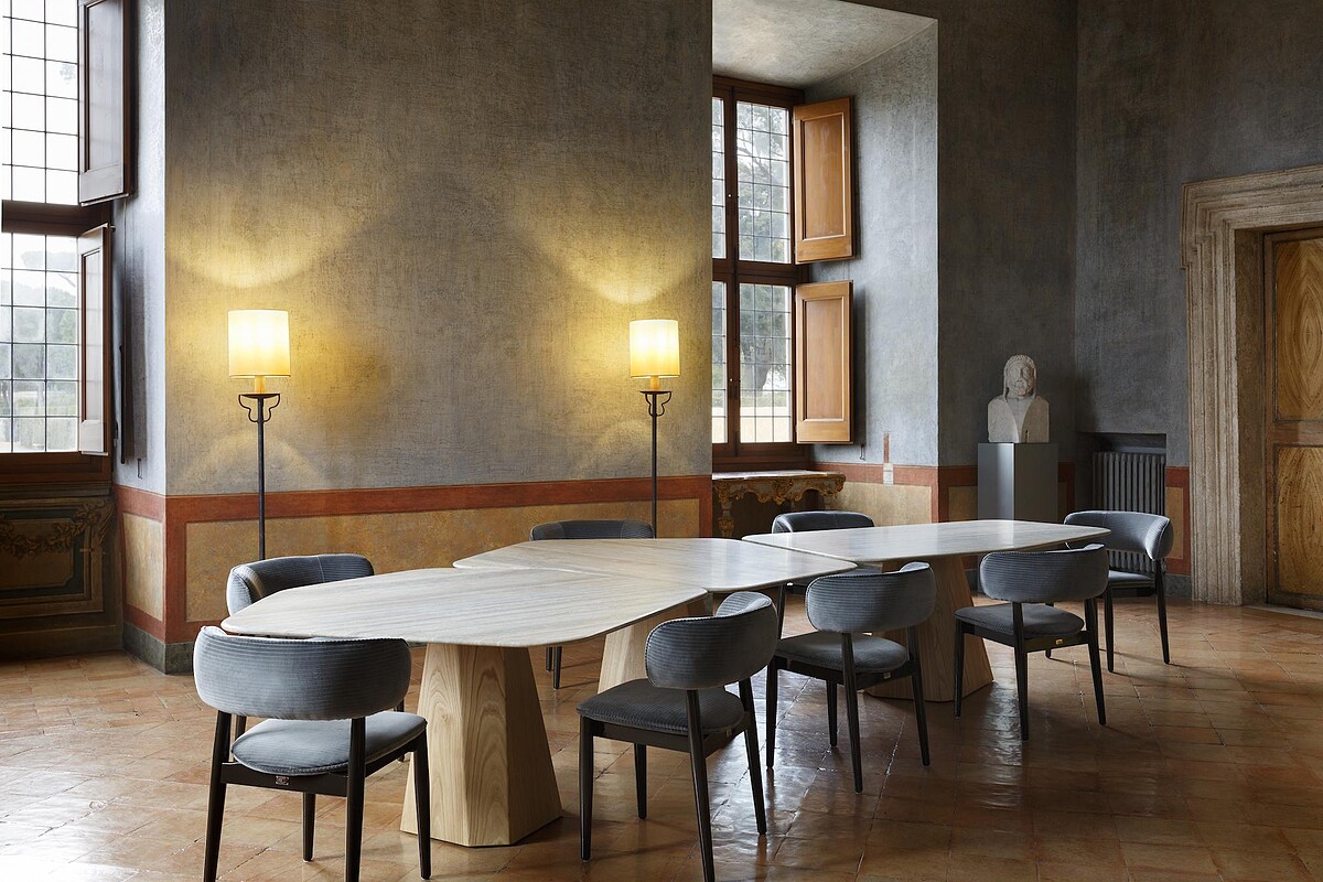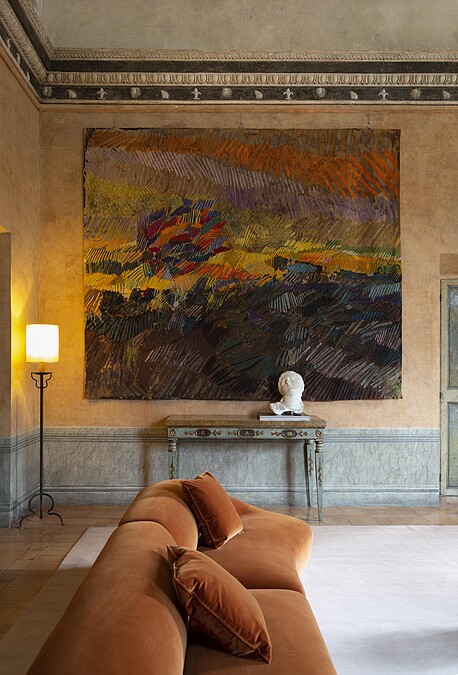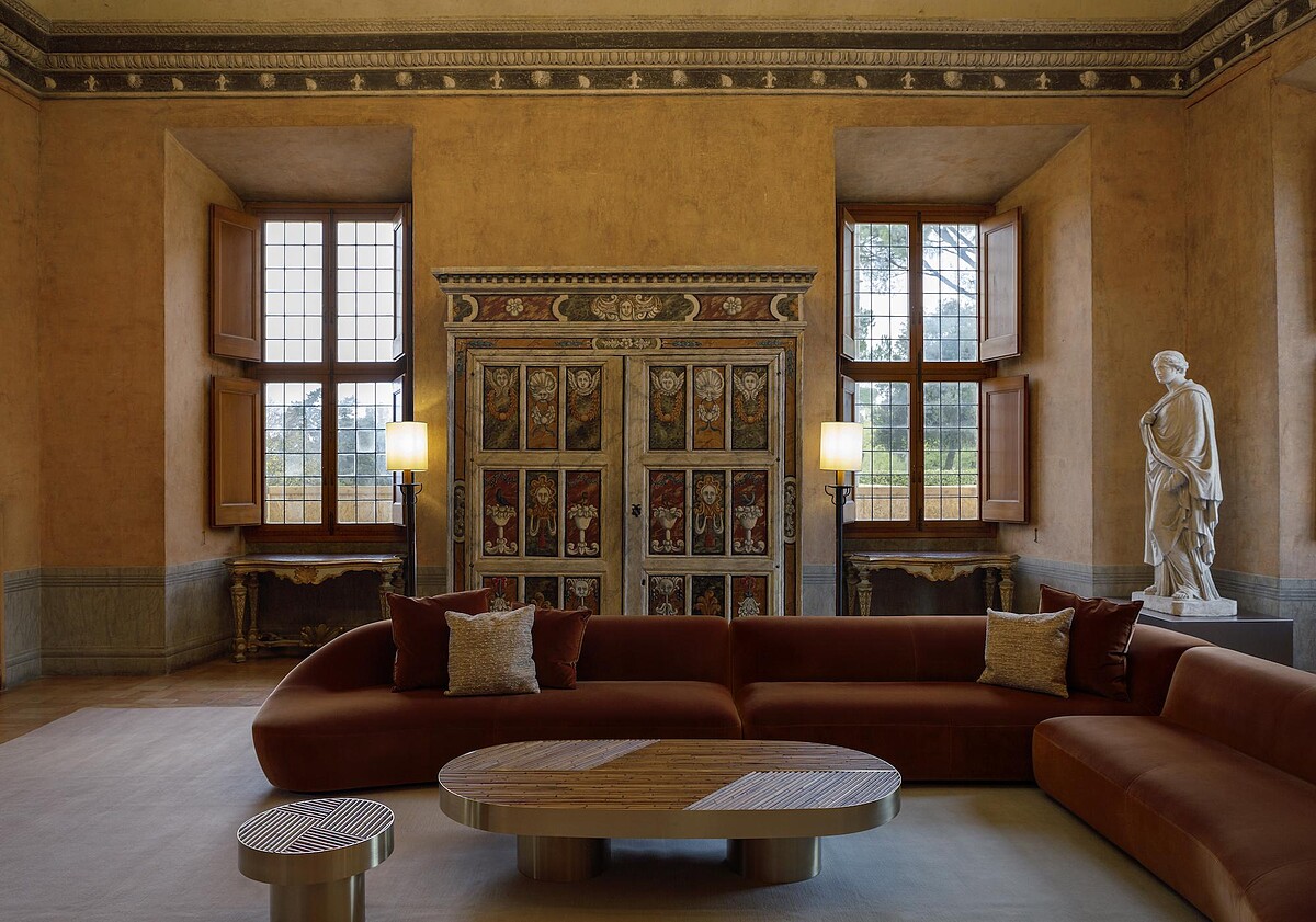 Fendi除了時裝本業,近年來也積極拓展居家美學,與義大利精品傢俱設計品牌Design Holding合作、打造全新的Fendi Casa支線。此回參與修復工作,由Kim Jones和 Silvia Venturini Fendi所主導,重點著墨於梅迪奇別墅的其中6大沙龍空間:Grand Salon、Salon des pensionnaires、Salon de musique、Salon de lecture、Salon Bleu以及Petit salon。要加入現代元素,卻又不能破壞古蹟建築遠有的平衡,兩人像是用了Photoshop裡的滴管功能,從梅迪奇別墅本有的色彩去做變化。