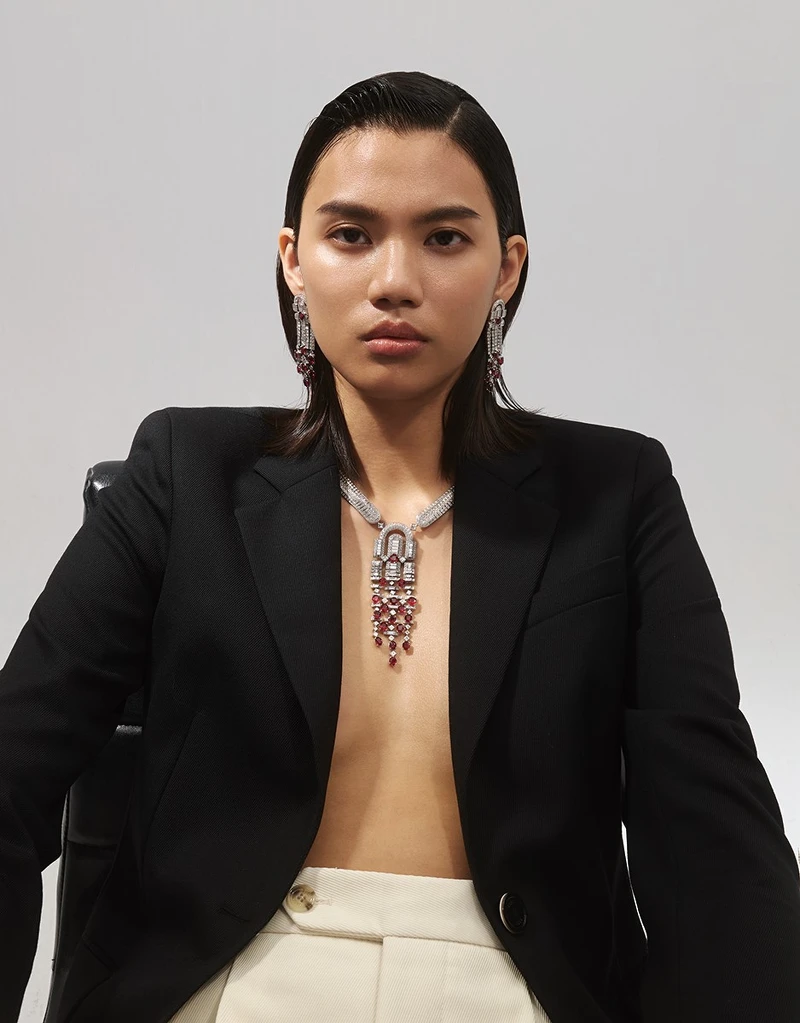 18K白金鑲嵌鑽石和紅寶石 Rolling Red耳環、18K白金鑲嵌鑽石和紅寶石 Rolling Red項鍊(流蘇墜飾可轉換為胸針),both by Boucheron。