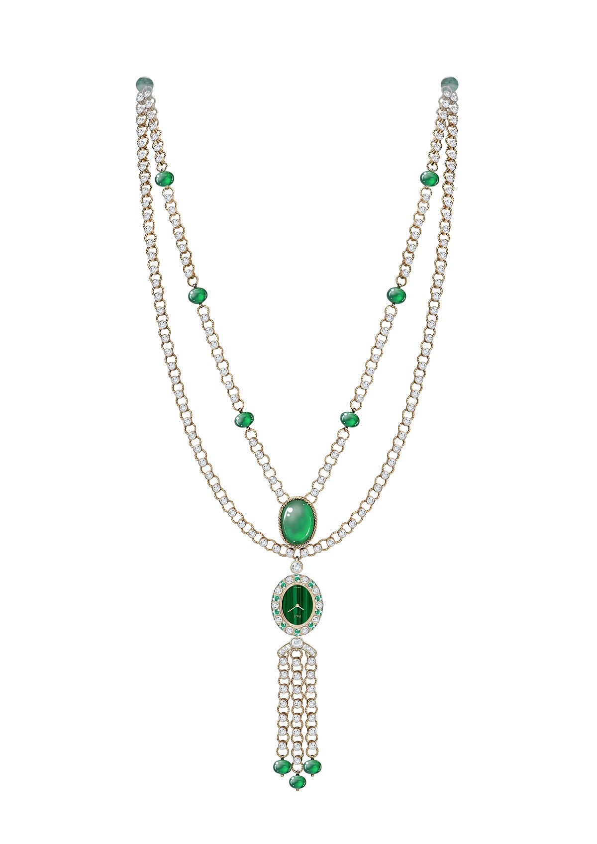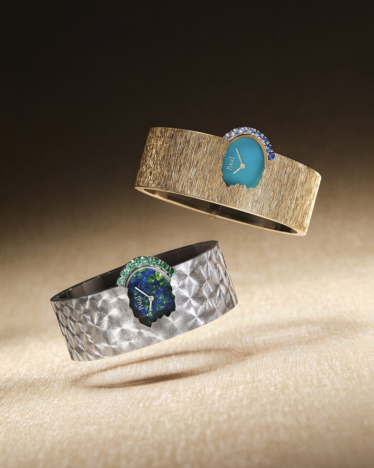 Piaget 回溯品牌六、八0年代最具風格代表的風格作品和技法,其中很重要的是當時那些誇耀的,不對稱的搶眼輪廓,還有先驅運用色澤鮮豔的硬寶石,大量啟用貴金屬和相對應的金工技術,比如以傳統製錶程序常見到的璣鏤(guilloché)鐫刻飾紋演變而來的獨家「宮廷式裝飾」(Palace Decor),與扭織金質鍊條製作;而今重現於別出心裁且形式多元的 Swinging Sautoir 項鍊錶、珠寶手鐲錶等多款2023年新作之上。