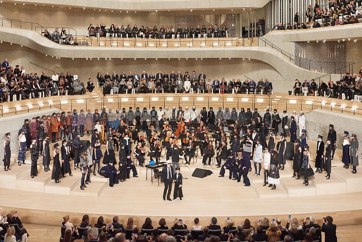 在德國漢堡的易北愛樂廳舉辦,可以說是 Karl Lagerfeld 的返鄉之旅,由名建築師雅克・赫爾佐格(Jacques Herzog)和皮埃爾・德・梅隆 (Pierre de Meuron)設計的梯形的音樂廳屹立在河畔,就像工業港口通往未來的連結,而過去、當下與未來,正是這系列的設計靈感。