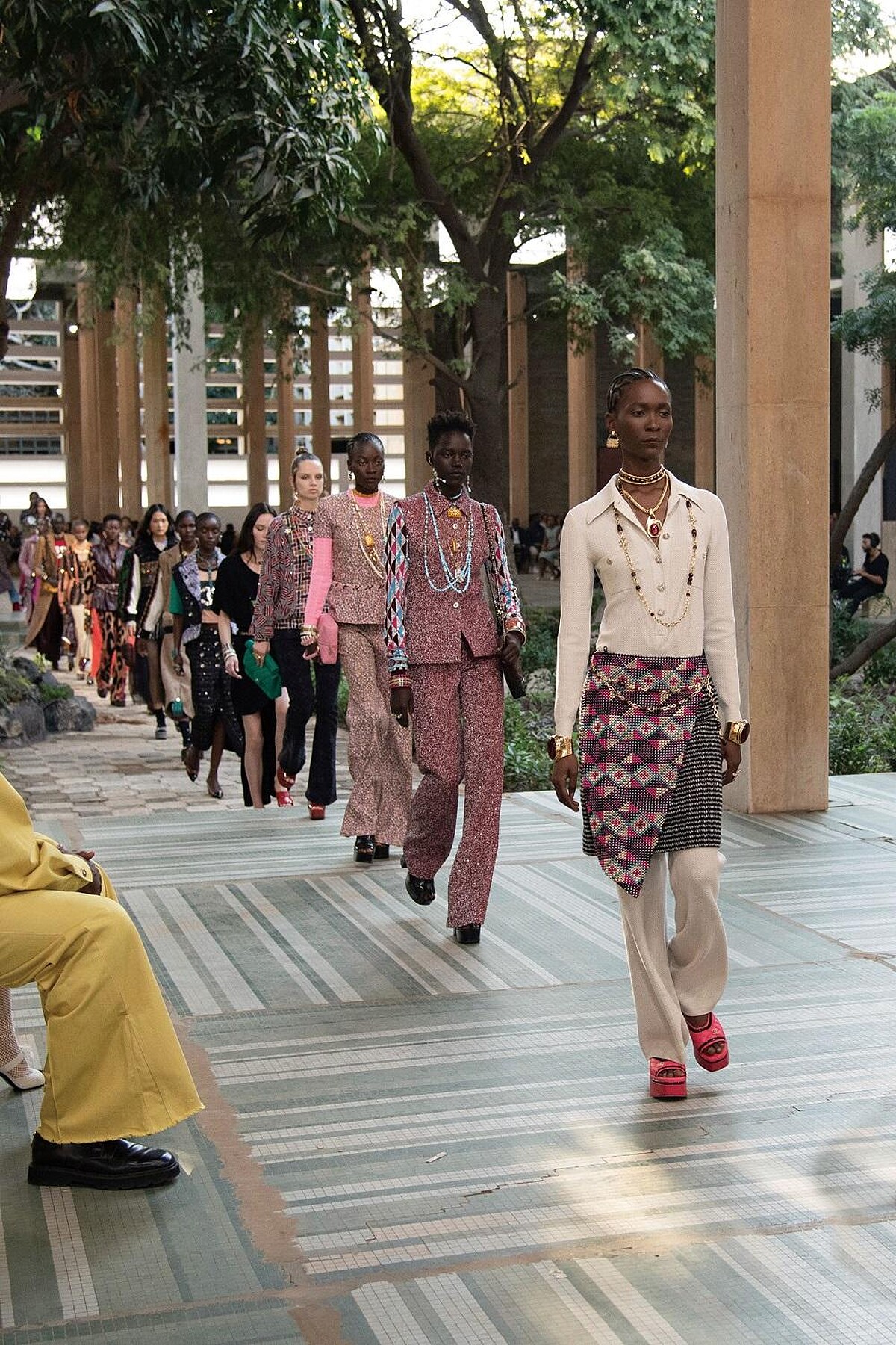 自由的非洲精神,也啟發維吉妮・維婭(Virginie Viard)以70年代風格貫穿全系列的設計靈感,繽紛活潑的色彩和精緻華麗的珠飾及亮片刺繡,與大量植物圖騰、線條與幾何形狀相呼應,帶出熱情奔放的非洲情懷,紋理豐富的斜紋軟呢喇叭長褲套裝、綴以花朵圖騰的飄逸洋裝、細膩蕾絲點綴洋裝,則流露品牌一貫的優雅氣息。