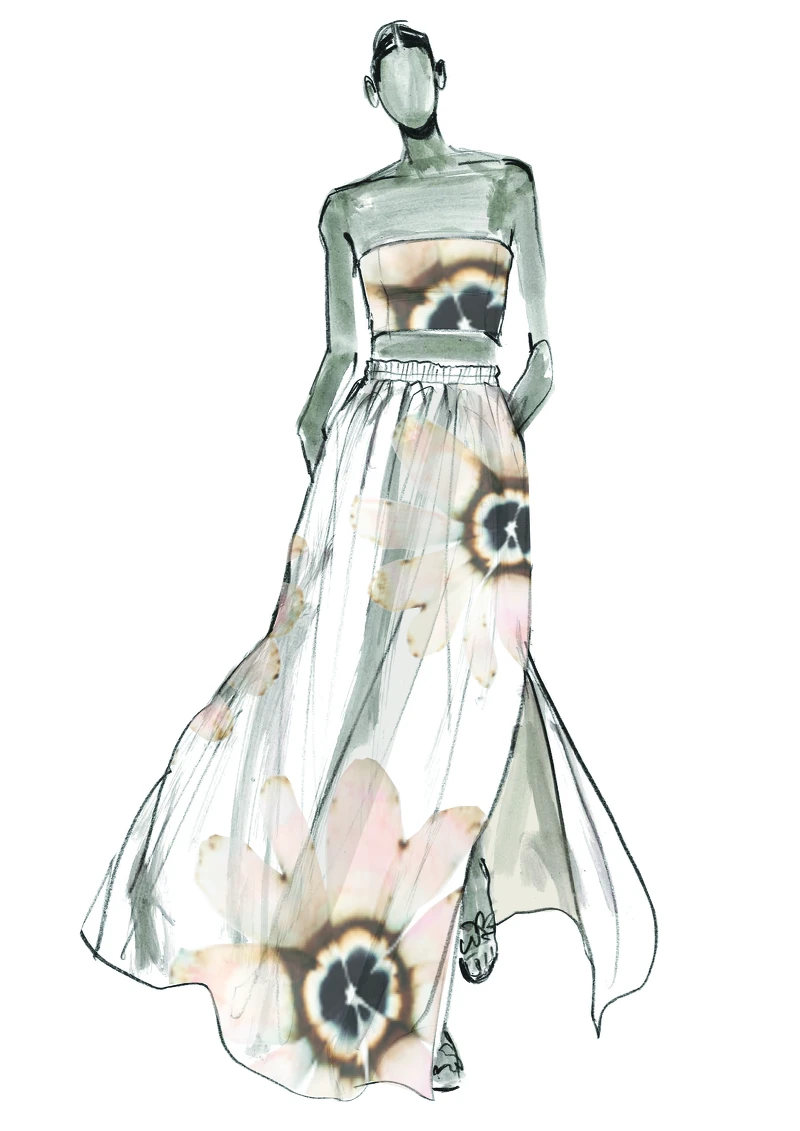 Stephen Doherty:I really love the trouser set. It has so much volume, the movement of the fabric really adds a sense of lightness. I also love the placement of the print on the shirt and the impression of the flower softly falling open as it wraps around the shoulder.