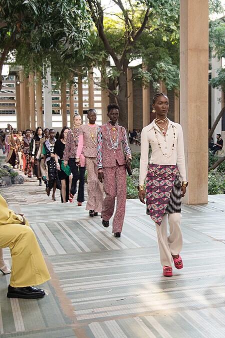 2022/23 Métiers d'art 工坊系列以維吉妮・維婭 (Virginie Viard)成長的70年代為核心,那年代,自由奔放且充滿熱情,迸發的能量兼容並蓄著所有的可能與不可能,取材非洲大自然的花卉與植物圖騰、優美線條與幾何圖案,與大量70年代經典的長形線條、緊身喇叭長褲、復古尖領、厚底鞋、繡滿花朵的彩色寬版長袖上衣、寫意的蕾絲洋裝…等,組合出活力四射的女人性格。