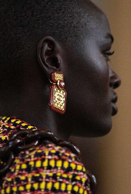 全系列由 CHANEL 巴黎創意工作室攜手 le19M 工坊總部內其中 11 間Maisons d'art 工坊合力完成,達卡常見的朱槿花化為精美的刺繡圖紋,為優雅的洋裝增添瀟灑的波西米亞氣息;非洲經典的馬賽克與珠串等藝術創作,也藉由 le19M 工坊資深工匠的巧手,運用木頭、寶石、彩色珠串等異材質,轉化成非洲民族風珠飾刺繡背心、圍裹裙等設計;看似簡單的丹寧面料喇叭褲,上頭亮片也經過多層印刷分層壓印,才能展現出細膩的工藝之美;經典的翻蓋包及 CHANEL 22 包款,或以輕盈的木頭打造出很具藝術氣息的背帶,或以繁複的橘棕色編織扭結和象徵達卡日落的橘紅色漸層漆皮菱格紋,呼應非洲大地自然、原始的生命力。