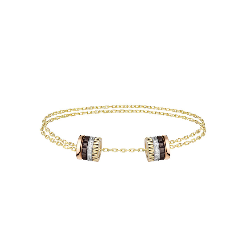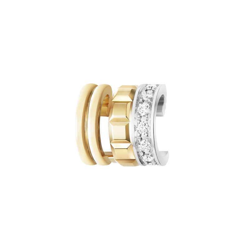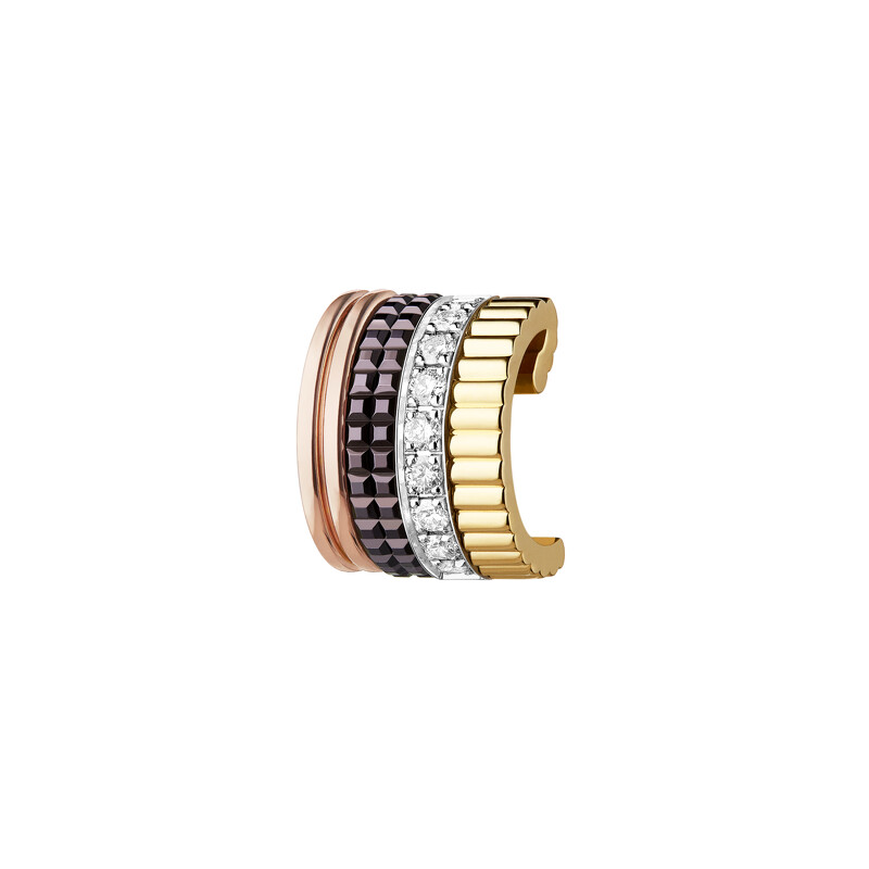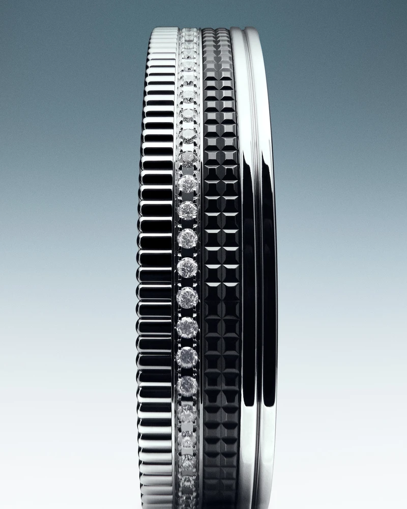 首先,像是裙襬波紋的羅緞直線刻紋(Grosgrain),讓人記憶起品牌創辦人 Frédéric Boucheron 的家族曾經營布料生意,簡約俐落的雙圈同心圓(Double Godron)據聞是 Frédéric 所研發的獨特技法,再來是呈現像是格狀的巴黎飾紋(Clou de Paris),凸顯著歷史悠遠的金匠智慧,也輝映了芳登廣場的石子地和26號總店建築裝飾細節,再來是鑽石排列(Row of Diamonds)—若是無鑲鑽款式,則改以高難度的無瑕鏡面金屬拋光細節,為所有雋刻紋路投注細緻光芒。Quatre 包含四種刻紋,也容納四種不同選材、質地與色彩,亮面18K玫瑰金、白金、黃金及霧面PVD陶瓷的玩味混用,滿載時髦態度與藝術氣氛,考慮當時推出的時間,其實是相當大膽新穎的自由組合!